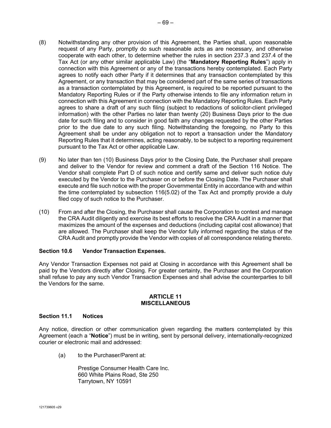 – 69 – 121739605 v29 (8) Notwithstanding any other provision of this Agreement, the Parties shall, upon reasonable request of any Party, promptly do such reasonable acts as are necessary, and otherwise cooperate with each other, to determine whether the rules in section 237.3 and 237.4 of the Tax Act (or any other similar applicable Law) (the “Mandatory Reporting Rules”) apply in connection with this Agreement or any of the transactions hereby contemplated. Each Party agrees to notify each other Party if it determines that any transaction contemplated by this Agreement, or any transaction that may be considered part of the same series of transactions as a transaction contemplated by this Agreement, is required to be reported pursuant to the Mandatory Reporting Rules or if the Party otherwise intends to file any information return in connection with this Agreement in connection with the Mandatory Reporting Rules. Each Party agrees to share a draft of any such filing (subject to redactions of solicitor-client privileged information) with the other Parties no later than twenty (20) Business Days prior to the due date for such filing and to consider in good faith any changes requested by the other Parties prior to the due date to any such filing. Notwithstanding the foregoing, no Party to this Agreement shall be under any obligation not to report a transaction under the Mandatory Reporting Rules that it determines, acting reasonably, to be subject to a reporting requirement pursuant to the Tax Act or other applicable Law. (9) No later than ten (10) Business Days prior to the Closing Date, the Purchaser shall prepare and deliver to the Vendor for review and comment a draft of the Section 116 Notice. The Vendor shall complete Part D of such notice and certify same and deliver such notice duly executed by the Vendor to the Purchaser on or before the Closing Date. The Purchaser shall execute and file such notice with the proper Governmental Entity in accordance with and within the time contemplated by subsection 116(5.02) of the Tax Act and promptly provide a duly filed copy of such notice to the Purchaser. (10) From and after the Closing, the Purchaser shall cause the Corporation to contest and manage the CRA Audit diligently and exercise its best efforts to resolve the CRA Audit in a manner that maximizes the amount of the expenses and deductions (including capital cost allowance) that are allowed. The Purchaser shall keep the Vendor fully informed regarding the status of the CRA Audit and promptly provide the Vendor with copies of all correspondence relating thereto. Section 10.6 Vendor Transaction Expenses. Any Vendor Transaction Expenses not paid at Closing in accordance with this Agreement shall be paid by the Vendors directly after Closing. For greater certainty, the Purchaser and the Corporation shall refuse to pay any such Vendor Transaction Expenses and shall advise the counterparties to bill the Vendors for the same. ARTICLE 11 MISCELLANEOUS Section 11.1 Notices Any notice, direction or other communication given regarding the matters contemplated by this Agreement (each a “Notice”) must be in writing, sent by personal delivery, internationally-recognized courier or electronic mail and addressed: (a) to the Purchaser/Parent at: Prestige Consumer Health Care Inc. 660 White Plains Road, Ste 250 Tarrytown, NY 10591