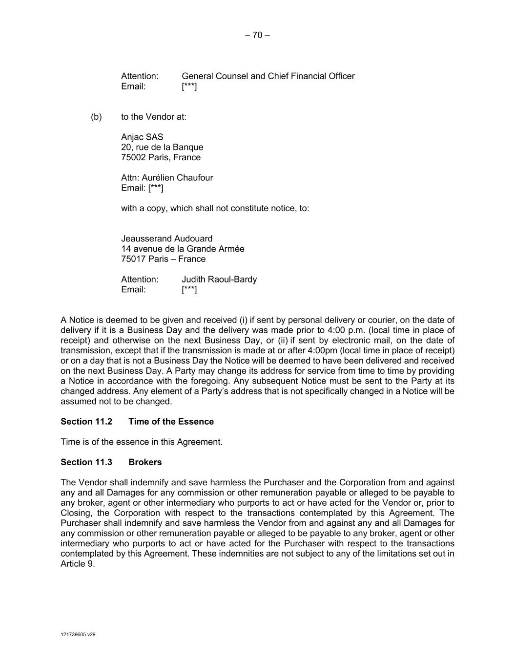 – 70 – 121739605 v29 Attention: General Counsel and Chief Financial Officer Email: [***] (b) to the Vendor at: Anjac SAS 20, rue de la Banque 75002 Paris, France Attn: Aurélien Chaufour Email: [***] with a copy, which shall not constitute notice, to: Jeausserand Audouard 14 avenue de la Grande Armée 75017 Paris – France Attention: Judith Raoul-Bardy Email: [***] A Notice is deemed to be given and received (i) if sent by personal delivery or courier, on the date of delivery if it is a Business Day and the delivery was made prior to 4:00 p.m. (local time in place of receipt) and otherwise on the next Business Day, or (ii) if sent by electronic mail, on the date of transmission, except that if the transmission is made at or after 4:00pm (local time in place of receipt) or on a day that is not a Business Day the Notice will be deemed to have been delivered and received on the next Business Day. A Party may change its address for service from time to time by providing a Notice in accordance with the foregoing. Any subsequent Notice must be sent to the Party at its changed address. Any element of a Party’s address that is not specifically changed in a Notice will be assumed not to be changed. Section 11.2 Time of the Essence Time is of the essence in this Agreement. Section 11.3 Brokers The Vendor shall indemnify and save harmless the Purchaser and the Corporation from and against any and all Damages for any commission or other remuneration payable or alleged to be payable to any broker, agent or other intermediary who purports to act or have acted for the Vendor or, prior to Closing, the Corporation with respect to the transactions contemplated by this Agreement. The Purchaser shall indemnify and save harmless the Vendor from and against any and all Damages for any commission or other remuneration payable or alleged to be payable to any broker, agent or other intermediary who purports to act or have acted for the Purchaser with respect to the transactions contemplated by this Agreement. These indemnities are not subject to any of the limitations set out in Article 9.