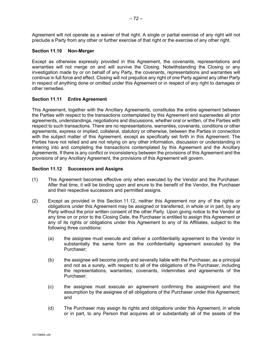 – 72 – 121739605 v29 Agreement will not operate as a waiver of that right. A single or partial exercise of any right will not preclude a Party from any other or further exercise of that right or the exercise of any other right. Section 11.10 Non-Merger Except as otherwise expressly provided in this Agreement, the covenants, representations and warranties will not merge on and will survive the Closing. Notwithstanding the Closing or any investigation made by or on behalf of any Party, the covenants, representations and warranties will continue in full force and effect. Closing will not prejudice any right of one Party against any other Party in respect of anything done or omitted under this Agreement or in respect of any right to damages or other remedies. Section 11.11 Entire Agreement This Agreement, together with the Ancillary Agreements, constitutes the entire agreement between the Parties with respect to the transactions contemplated by this Agreement and supersedes all prior agreements, understandings, negotiations and discussions, whether oral or written, of the Parties with respect to such transactions. There are no representations, warranties, covenants, conditions or other agreements, express or implied, collateral, statutory or otherwise, between the Parties in connection with the subject matter of this Agreement, except as specifically set forth in this Agreement. The Parties have not relied and are not relying on any other information, discussion or understanding in entering into and completing the transactions contemplated by this Agreement and the Ancillary Agreements. If there is any conflict or inconsistency between the provisions of this Agreement and the provisions of any Ancillary Agreement, the provisions of this Agreement will govern. Section 11.12 Successors and Assigns (1) This Agreement becomes effective only when executed by the Vendor and the Purchaser. After that time, it will be binding upon and enure to the benefit of the Vendor, the Purchaser and their respective successors and permitted assigns. (2) Except as provided in this Section 11.12, neither this Agreement nor any of the rights or obligations under this Agreement may be assigned or transferred, in whole or in part, by any Party without the prior written consent of the other Party. Upon giving notice to the Vendor at any time on or prior to the Closing Date, the Purchaser is entitled to assign this Agreement or any of its rights or obligations under this Agreement to any of its Affiliates, subject to the following three conditions: (a) the assignee must execute and deliver a confidentiality agreement to the Vendor in substantially the same form as the confidentiality agreement executed by the Purchaser; (b) the assignee will become jointly and severally liable with the Purchaser, as a principal and not as a surety, with respect to all of the obligations of the Purchaser, including the representations, warranties, covenants, indemnities and agreements of the Purchaser; (c) the assignee must execute an agreement confirming the assignment and the assumption by the assignee of all obligations of the Purchaser under this Agreement; and (d) The Purchaser may assign its rights and obligations under this Agreement, in whole or in part, to any Person that acquires all or substantially all of the assets of the