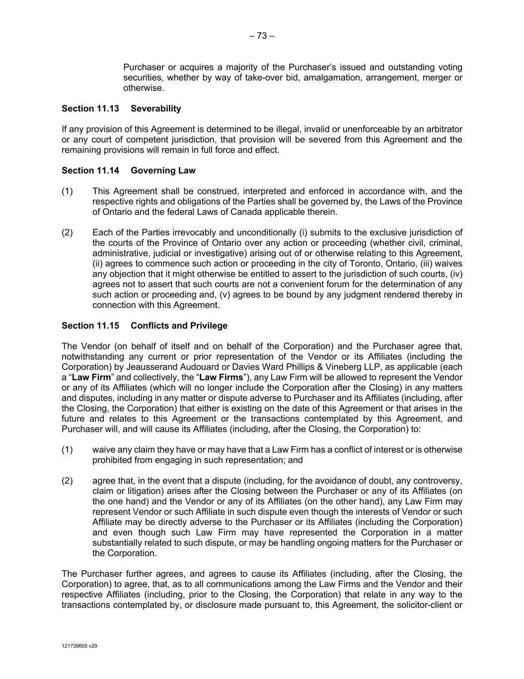 – 73 – 121739605 v29 Purchaser or acquires a majority of the Purchaser’s issued and outstanding voting securities, whether by way of take-over bid, amalgamation, arrangement, merger or otherwise. Section 11.13 Severability If any provision of this Agreement is determined to be illegal, invalid or unenforceable by an arbitrator or any court of competent jurisdiction, that provision will be severed from this Agreement and the remaining provisions will remain in full force and effect. Section 11.14 Governing Law (1) This Agreement shall be construed, interpreted and enforced in accordance with, and the respective rights and obligations of the Parties shall be governed by, the Laws of the Province of Ontario and the federal Laws of Canada applicable therein. (2) Each of the Parties irrevocably and unconditionally (i) submits to the exclusive jurisdiction of the courts of the Province of Ontario over any action or proceeding (whether civil, criminal, administrative, judicial or investigative) arising out of or otherwise relating to this Agreement, (ii) agrees to commence such action or proceeding in the city of Toronto, Ontario, (iii) waives any objection that it might otherwise be entitled to assert to the jurisdiction of such courts, (iv) agrees not to assert that such courts are not a convenient forum for the determination of any such action or proceeding and, (v) agrees to be bound by any judgment rendered thereby in connection with this Agreement. Section 11.15 Conflicts and Privilege The Vendor (on behalf of itself and on behalf of the Corporation) and the Purchaser agree that, notwithstanding any current or prior representation of the Vendor or its Affiliates (including the Corporation) by Jeausserand Audouard or Davies Ward Phillips & Vineberg LLP, as applicable (each a “Law Firm” and collectively, the “Law Firms”), any Law Firm will be allowed to represent the Vendor or any of its Affiliates (which will no longer include the Corporation after the Closing) in any matters and disputes, including in any matter or dispute adverse to Purchaser and its Affiliates (including, after the Closing, the Corporation) that either is existing on the date of this Agreement or that arises in the future and relates to this Agreement or the transactions contemplated by this Agreement, and Purchaser will, and will cause its Affiliates (including, after the Closing, the Corporation) to: (1) waive any claim they have or may have that a Law Firm has a conflict of interest or is otherwise prohibited from engaging in such representation; and (2) agree that, in the event that a dispute (including, for the avoidance of doubt, any controversy, claim or litigation) arises after the Closing between the Purchaser or any of its Affiliates (on the one hand) and the Vendor or any of its Affiliates (on the other hand), any Law Firm may represent Vendor or such Affiliate in such dispute even though the interests of Vendor or such Affiliate may be directly adverse to the Purchaser or its Affiliates (including the Corporation) and even though such Law Firm may have represented the Corporation in a matter substantially related to such dispute, or may be handling ongoing matters for the Purchaser or the Corporation. The Purchaser further agrees, and agrees to cause its Affiliates (including, after the Closing, the Corporation) to agree, that, as to all communications among the Law Firms and the Vendor and their respective Affiliates (including, prior to the Closing, the Corporation) that relate in any way to the transactions contemplated by, or disclosure made pursuant to, this Agreement, the solicitor-client or