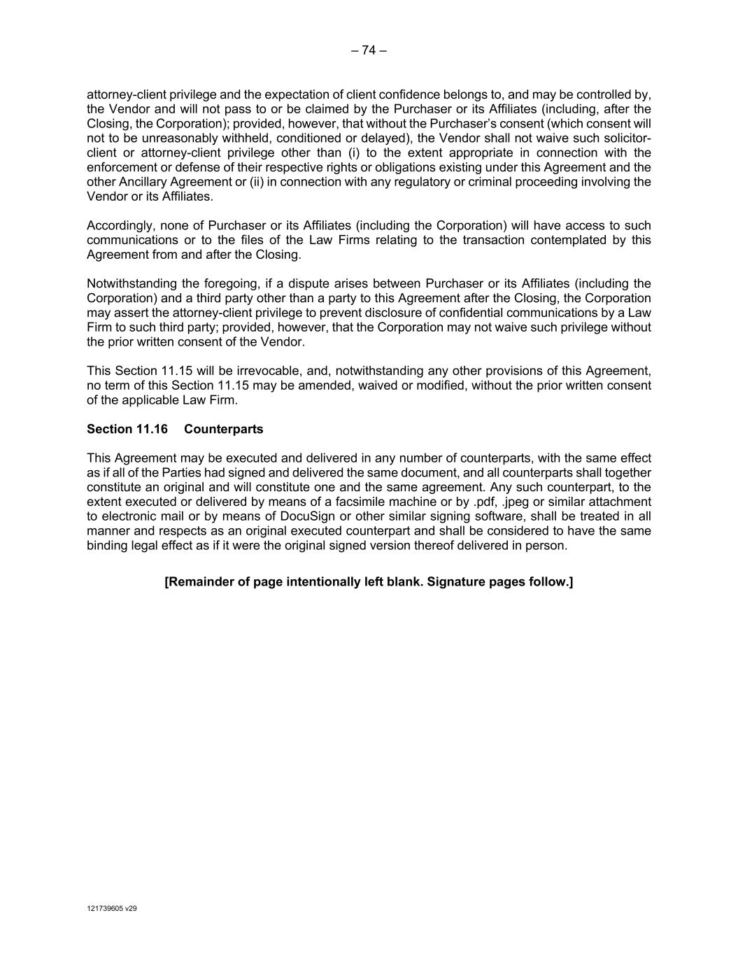 – 74 – 121739605 v29 attorney-client privilege and the expectation of client confidence belongs to, and may be controlled by, the Vendor and will not pass to or be claimed by the Purchaser or its Affiliates (including, after the Closing, the Corporation); provided, however, that without the Purchaser’s consent (which consent will not to be unreasonably withheld, conditioned or delayed), the Vendor shall not waive such solicitor- client or attorney-client privilege other than (i) to the extent appropriate in connection with the enforcement or defense of their respective rights or obligations existing under this Agreement and the other Ancillary Agreement or (ii) in connection with any regulatory or criminal proceeding involving the Vendor or its Affiliates. Accordingly, none of Purchaser or its Affiliates (including the Corporation) will have access to such communications or to the files of the Law Firms relating to the transaction contemplated by this Agreement from and after the Closing. Notwithstanding the foregoing, if a dispute arises between Purchaser or its Affiliates (including the Corporation) and a third party other than a party to this Agreement after the Closing, the Corporation may assert the attorney-client privilege to prevent disclosure of confidential communications by a Law Firm to such third party; provided, however, that the Corporation may not waive such privilege without the prior written consent of the Vendor. This Section 11.15 will be irrevocable, and, notwithstanding any other provisions of this Agreement, no term of this Section 11.15 may be amended, waived or modified, without the prior written consent of the applicable Law Firm. Section 11.16 Counterparts This Agreement may be executed and delivered in any number of counterparts, with the same effect as if all of the Parties had signed and delivered the same document, and all counterparts shall together constitute an original and will constitute one and the same agreement. Any such counterpart, to the extent executed or delivered by means of a facsimile machine or by .pdf, .jpeg or similar attachment to electronic mail or by means of DocuSign or other similar signing software, shall be treated in all manner and respects as an original executed counterpart and shall be considered to have the same binding legal effect as if it were the original signed version thereof delivered in person. [Remainder of page intentionally left blank. Signature pages follow.]