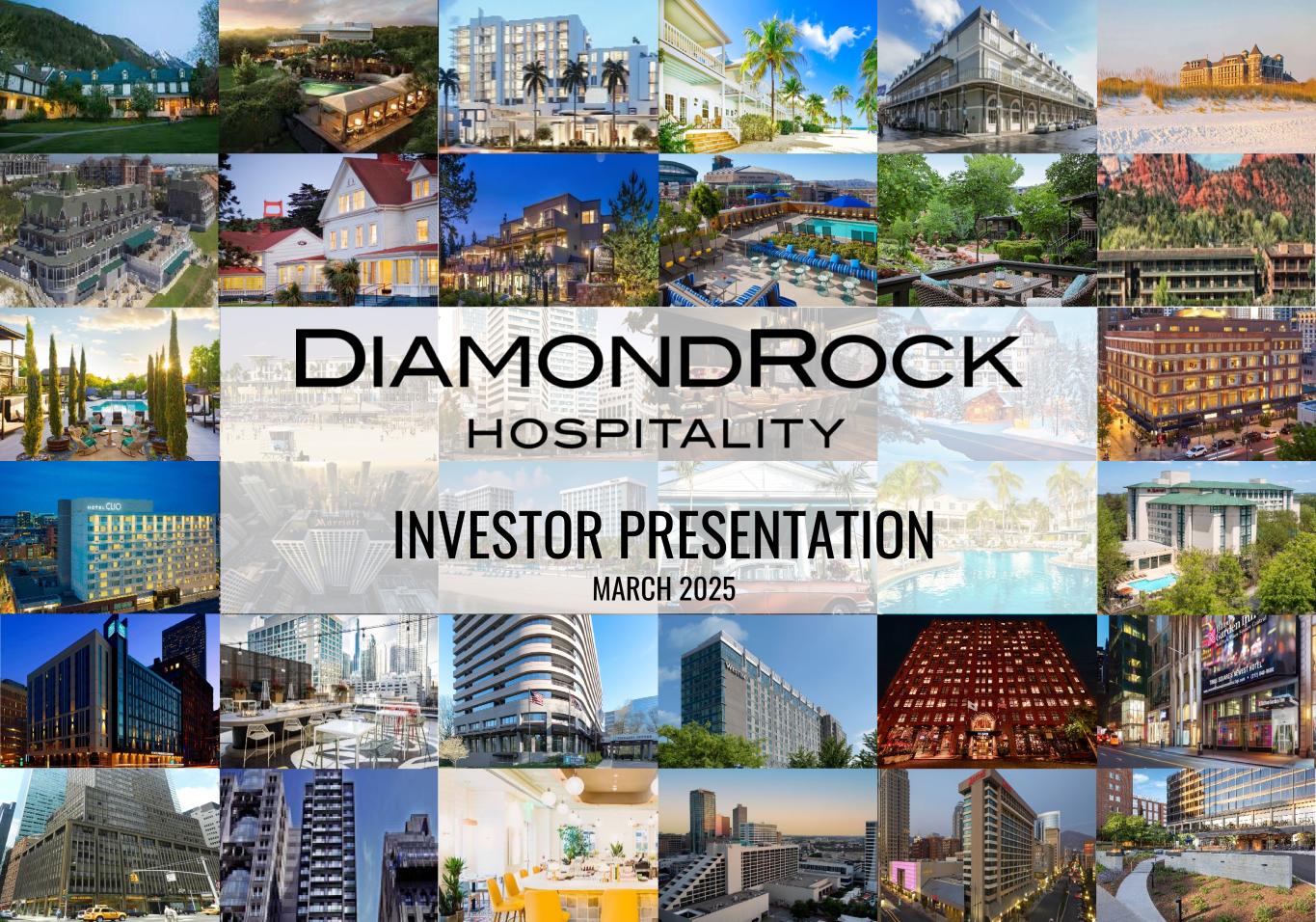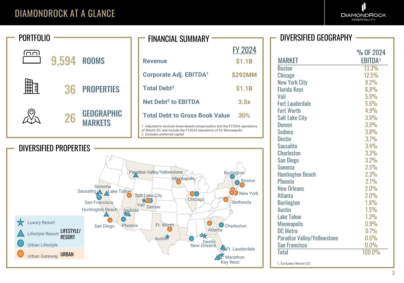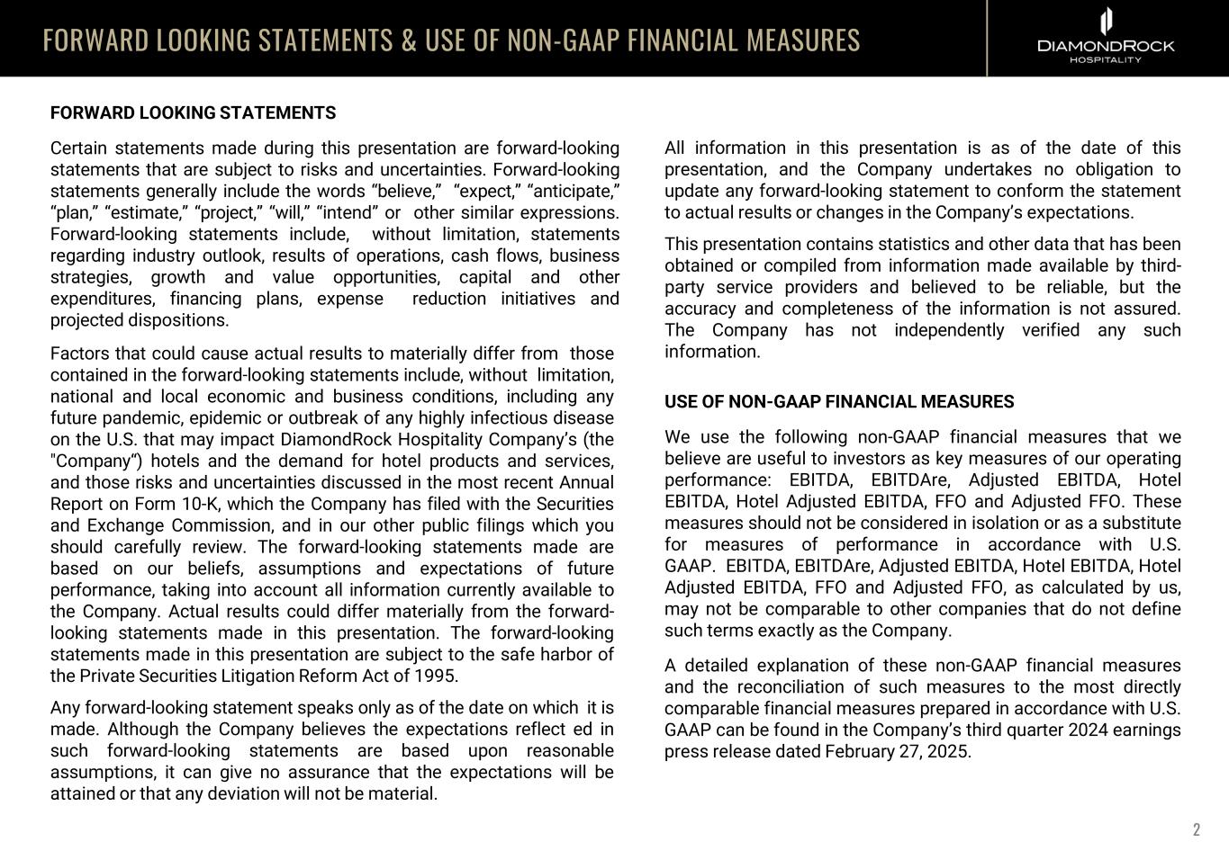 FORWARD LOOKING STATEMENTS & USE OF NON-GAAP FINANCIAL MEASURES FORWARD LOOKING STATEMENTS Certain statements made during this presentation are forward-looking statements that are subject to risks and uncertainties. Forward-looking statements generally include the words “believe,” “expect,” “anticipate,” “plan,” “estimate,” “project,” “will,” “intend” or other similar expressions. Forward-looking statements include, without limitation, statements regarding industry outlook, results of operations, cash flows, business strategies, growth and value opportunities, capital and other expenditures, financing plans, expense reduction initiatives and projected dispositions. Factors that could cause actual results to materially differ from those contained in the forward-looking statements include, without limitation, national and local economic and business conditions, including any future pandemic, epidemic or outbreak of any highly infectious disease on the U.S. that may impact DiamondRock Hospitality Company’s (the "Company“) hotels and the demand for hotel products and services, and those risks and uncertainties discussed in the most recent Annual Report on Form 10-K, which the Company has filed with the Securities and Exchange Commission, and in our other public filings which you should carefully review. The forward-looking statements made are based on our beliefs, assumptions and expectations of future performance, taking into account all information currently available to the Company. Actual results could differ materially from the forward- looking statements made in this presentation. The forward-looking statements made in this presentation are subject to the safe harbor of the Private Securities Litigation Reform Act of 1995. Any forward-looking statement speaks only as of the date on which it is made. Although the Company believes the expectations reflect ed in such forward-looking statements are based upon reasonable assumptions, it can give no assurance that the expectations will be attained or that any deviation will not be material. All information in this presentation is as of the date of this presentation, and the Company undertakes no obligation to update any forward-looking statement to conform the statement to actual results or changes in the Company’s expectations. This presentation contains statistics and other data that has been obtained or compiled from information made available by third- party service providers and believed to be reliable, but the accuracy and completeness of the information is not assured. The Company has not independently verified any such information. USE OF NON-GAAP FINANCIAL MEASURES We use the following non-GAAP financial measures that we believe are useful to investors as key measures of our operating performance: EBITDA, EBITDAre, Adjusted EBITDA, Hotel EBITDA, Hotel Adjusted EBITDA, FFO and Adjusted FFO. These measures should not be considered in isolation or as a substitute for measures of performance in accordance with U.S. GAAP. EBITDA, EBITDAre, Adjusted EBITDA, Hotel EBITDA, Hotel Adjusted EBITDA, FFO and Adjusted FFO, as calculated by us, may not be comparable to other companies that do not define such terms exactly as the Company. A detailed explanation of these non-GAAP financial measures and the reconciliation of such measures to the most directly comparable financial measures prepared in accordance with U.S. GAAP can be found in the Company’s third quarter 2024 earnings press release dated February 27, 2025. 2