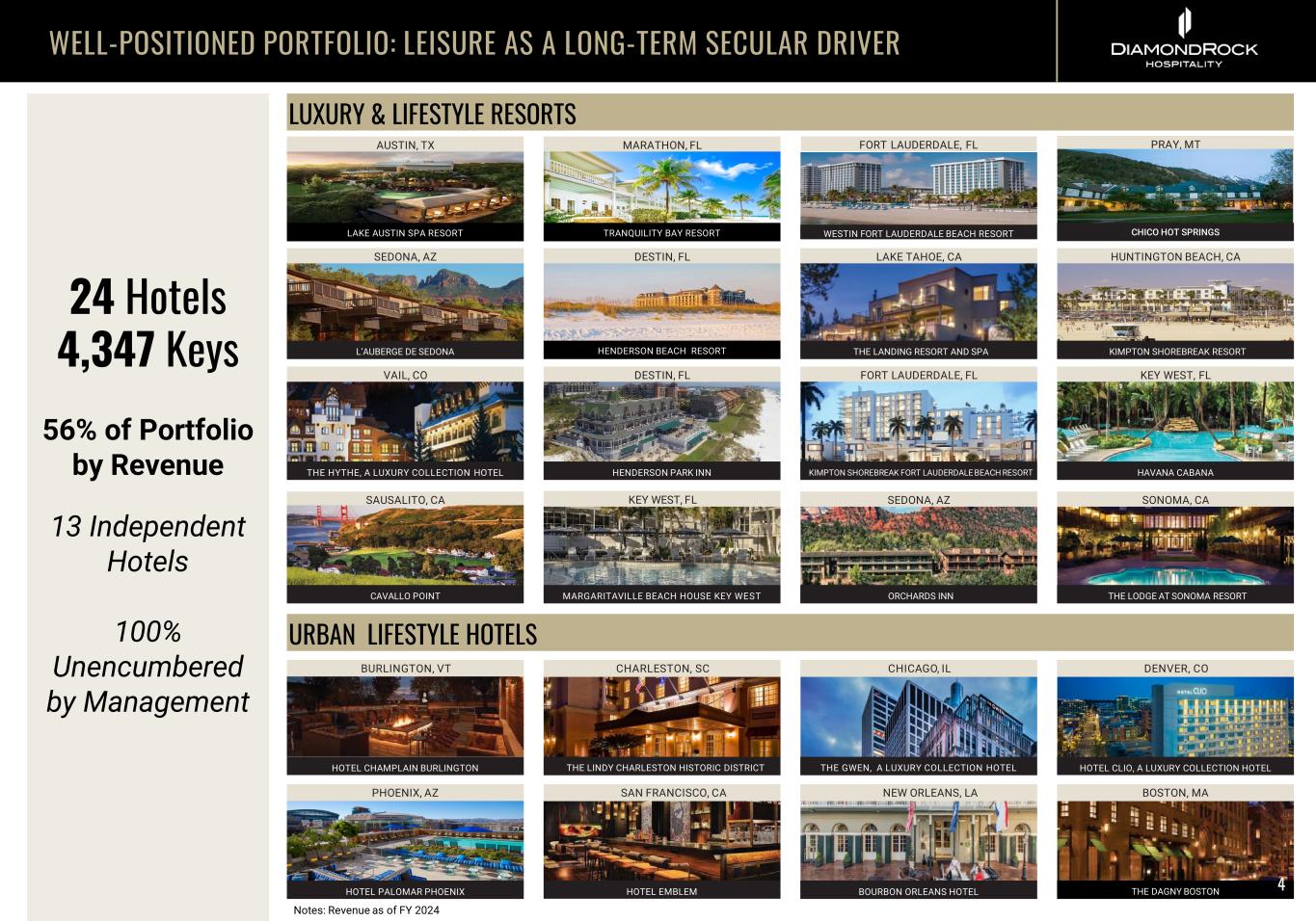 DIAMONDROCK AT A GLANCE DIVERSIFIED GEOGRAPHY DIVERSIFIED PROPERTIES FINANCIAL SUMMARY Net Debt2 to EBITDA Total Debt2 $1.1B 3.5x Total Debt to Gross Book Value 30% Revenue $1.1B Corporate Adj. EBITDA1 $292MM FY 2024 PORTFOLIO 9,594 36 26 ROOMS GEOGRAPHIC MARKETS PROPERTIES 1. Adjusted to exclude share-based compensation and the FY2024 operations of Westin DC and include the FY2024 operations of AC Minneapolis 2. Excludes preferred capital 3 MARKET % OF 2024 EBITDA1 Boston 13.3% Chicago 12.5% New York City 8.2% Florida Keys 6.8% Vail 5.9% Fort Lauderdale 5.6% Fort Worth 4.9% Salt Lake City 3.9% Denver 3.9% Sedona 3.8% Destin 3.7% Sausalito 3.4% Charleston 3.3% San Diego 3.2% Sonoma 2.5% Huntington Beach 2.3% Phoenix 2.1% New Orleans 2.0% Atlanta 2.0% Burlington 1.8% Austin 1.5% Lake Tahoe 1.3% Minneapolis 0.9% DC Metro 0.7% Paradise Valley/Yellowstone 0.6% San Francisco 0.0% Total 100.0% Luxury Resort Lifestyle Resort Urban Lifestyle Urban Gateway LIFESTYLE/ RESORT URBAN Boston Ft. Worth Ft. Lauderdale Chicago Vail Sausalito Salt Lake City San Diego Key West Sonoma Burlington Phoenix Denver Destin Atlanta Huntington Beach Charleston New Orleans San Francisco Lake Tahoe Sedona New York Austin Paradise Valley/Yellowstone Marathon Minneapolis Bethesda 1. Excludes Westin DC