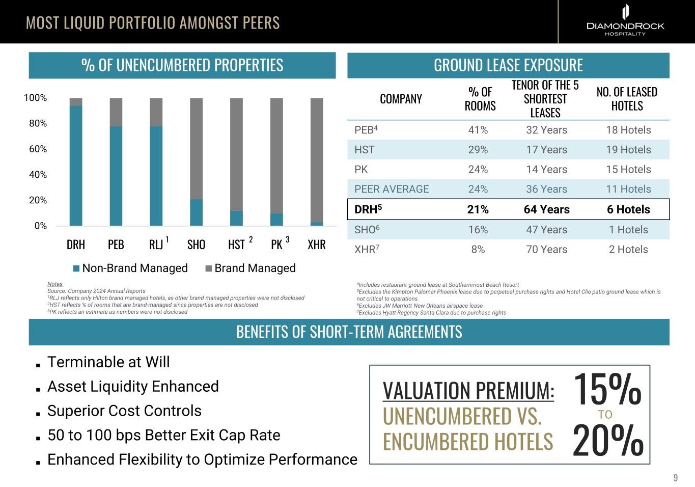 MOST LIQUID PORTFOLIO AMONGST PEERS BENEFITS OF SHORT-TERM AGREEMENTS ■ Terminable at Will ■ Asset Liquidity Enhanced ■ Superior Cost Controls ■ 50 to 100 bps Better Exit Cap Rate ■ Enhanced Flexibility to Optimize Performance VALUATION PREMIUM: UNENCUMBERED VS. ENCUMBERED HOTELS 15% 20% 0% 20% 40% 60% 80% 100% DRH PEB RLJ SHO HST PK XHR Non-Brand Managed Brand Managed % OF UNENCUMBERED PROPERTIES Notes Source: Company 2024 Annual Reports 1RLJ reflects only Hilton brand managed hotels, as other brand managed properties were not disclosed 2HST reflects % of rooms that are brand-managed since properties are not disclosed 3PK reflects an estimate as numbers were not disclosed GROUND LEASE EXPOSURE COMPANY % OF ROOMS TENOR OF THE 5 SHORTEST LEASES NO. OF LEASED HOTELS PEB4 41% 32 Years 18 Hotels HST 29% 17 Years 19 Hotels PK 24% 14 Years 15 Hotels PEER AVERAGE 24% 36 Years 11 Hotels DRH5 21% 64 Years 6 Hotels SHO6 16% 47 Years 1 Hotels XHR7 8% 70 Years 2 Hotels 9 21 3 4Includes restaurant ground lease at Southernmost Beach Resort 5Excludes the Kimpton Palomar Phoenix lease due to perpetual purchase rights and Hotel Clio patio ground lease which is not critical to operations 6Excludes JW Marriott New Orleans airspace lease 7Excludes Hyatt Regency Santa Clara due to purchase rights TO