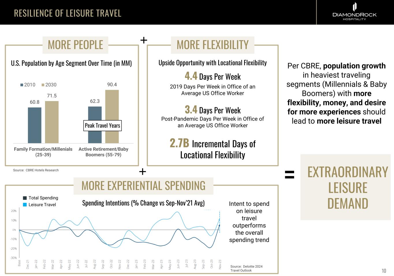 RESILIENCE OF LEISURE TRAVEL Per CBRE, population growth in heaviest traveling segments (Millennials & Baby Boomers) with more flexibility, money, and desire for more experiences should lead to more leisure travel 60.8 62.3 71.5 90.4 Family Formation/Millenials (25-39) Active Retirement/Baby Boomers (55-79) 2010 2030 U.S. Population by Age Segment Over Time (in MM) Peak Travel Years EXTRAORDINARY LEISURE DEMAND = 4.4 Days Per Week 2019 Days Per Week in Office of an Average US Office Worker 3.4 Days Per Week Post-Pandemic Days Per Week in Office of an Average US Office Worker 2.7B Incremental Days of Locational Flexibility Upside Opportunity with Locational Flexibility Source: CBRE Hotels Research MORE PEOPLE MORE FLEXIBILITY Intent to spend on leisure travel outperforms the overall spending trend Spending Intentions (% Change vs Sep-Nov’21 Avg) Total Spending Leisure Travel Source: Deloitte 2024 Travel Outlook MORE EXPERIENTIAL SPENDING 10