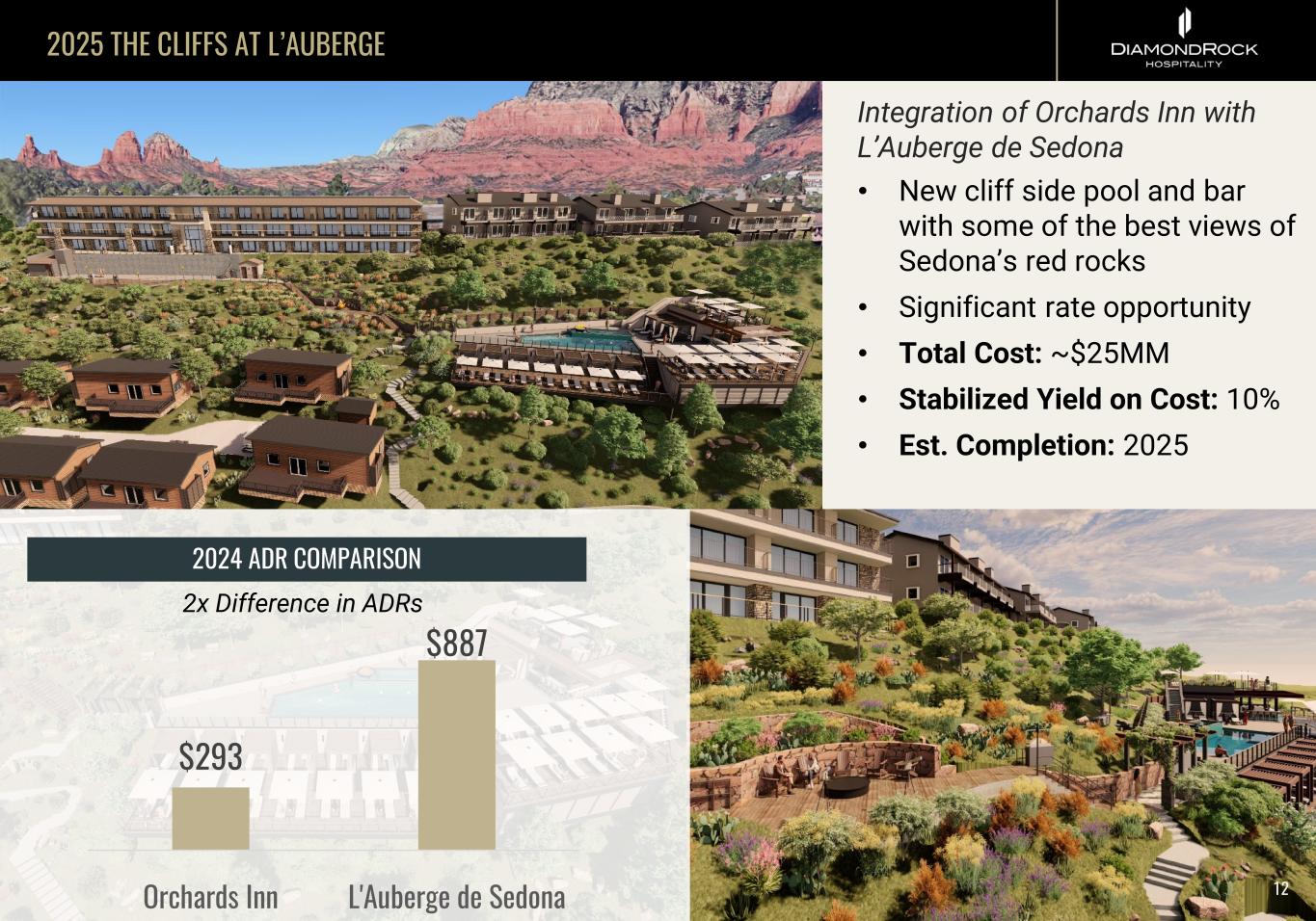 HIGH EXPOSURE IN LIMITED SUPPLY MARKETS 1 Methodology: 3 year average of CoStar 12 month supply change forecast (2024 – 2026); green light < 1%, yellow light <1-3%, red light 3%+ MARKET % OF 2024 EBITDA SUPPLY FORECAST1 RESORT MARKETS Florida Keys 6.8% Vail 5.9% Fort Lauderdale 5.6% Sedona 3.8% Destin 3.7% Sonoma 2.5% Lake Austin 1.5% Lake Tahoe 1.3% Paradise Valley/Yellowstone 0.6% DRH hotels are located in low supply markets, with some resort markets having negligible supply growth MARKET % OF 2024 EBITDA SUPPLY FORECAST1 URBAN MARKETS Boston 13.3% Chicago 12.5% New York City 8.2% Fort Worth 4.9% Salt Lake City 3.9% Denver 3.9% Sausalito 3.4% 11