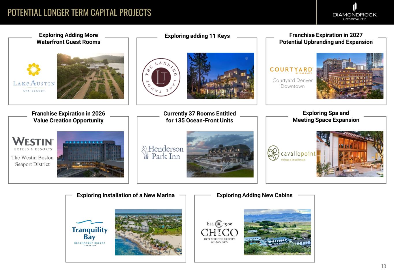 2025 THE CLIFFS AT L’AUBERGE • New cliff side pool and bar with some of the best views of Sedona’s red rocks • Significant rate opportunity • Total Cost: ~$25MM • Stabilized Yield on Cost: 10% • Est. Completion: 2025 Integration of Orchards Inn with L’Auberge de Sedona 2024 ADR COMPARISON 2x Difference in ADRs 12 $293 $887 Orchards Inn L'Auberge de Sedona