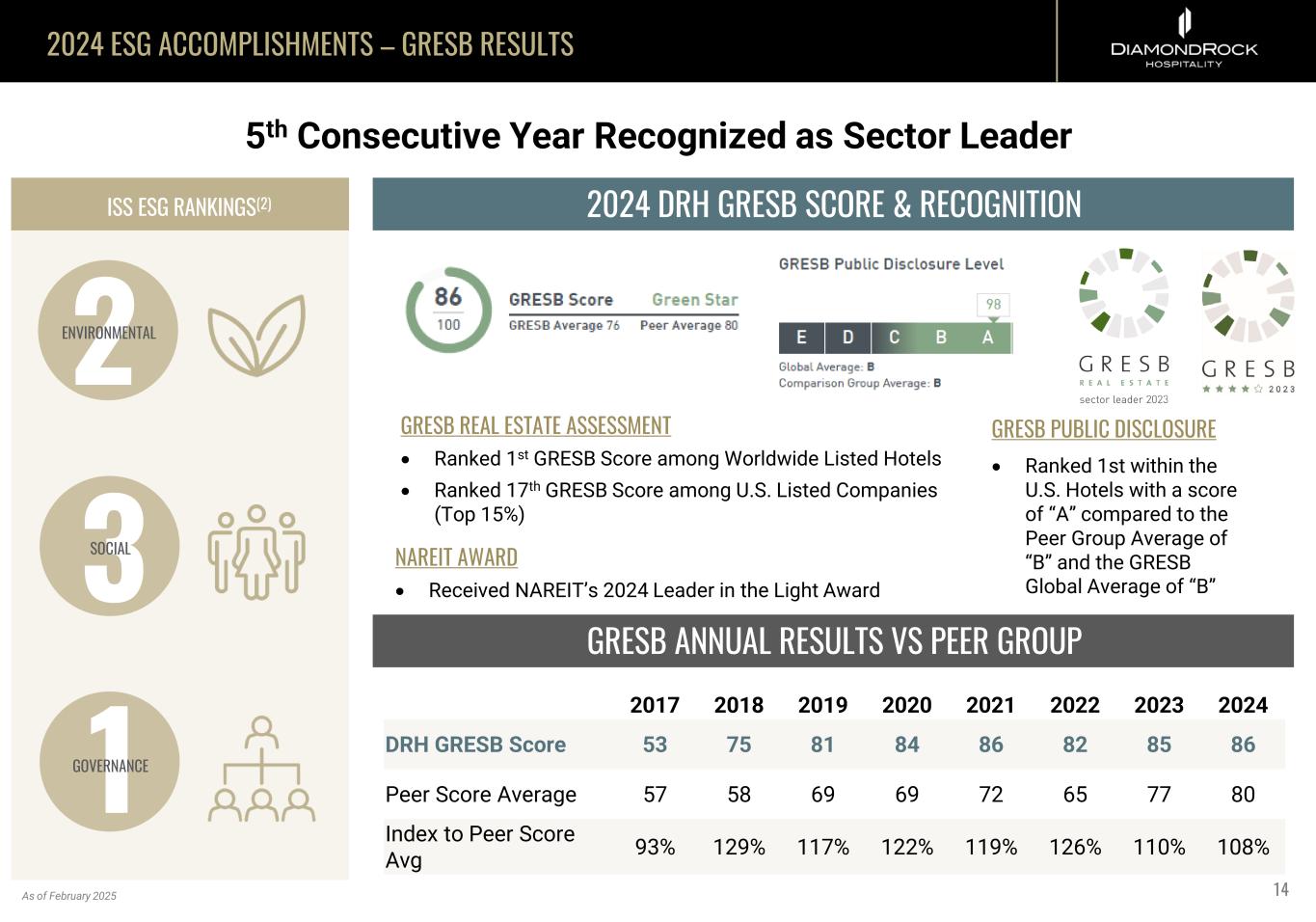 2024 ESG ACCOMPLISHMENTS – GRESB RESULTS GRESB ANNUAL RESULTS VS PEER GROUP 2017 2018 2019 2020 2021 2022 2023 2024 DRH GRESB Score 53 75 81 84 86 82 85 86 Peer Score Average 57 58 69 69 72 65 77 80 Index to Peer Score Avg 93% 129% 117% 122% 119% 126% 110% 108% 2024 DRH GRESB SCORE & RECOGNITION 5th Consecutive Year Recognized as Sector Leader GRESB REAL ESTATE ASSESSMENT • Ranked 1st GRESB Score among Worldwide Listed Hotels • Ranked 17th GRESB Score among U.S. Listed Companies (Top 15%) 14 GRESB PUBLIC DISCLOSURE • Ranked 1st within the U.S. Hotels with a score of “A” compared to the Peer Group Average of “B” and the GRESB Global Average of “B” ISS ESG RANKINGS(2) 2ENVIRONMENTAL 3SOCIAL 1GOVERNANCE As of February 2025 NAREIT AWARD • Received NAREIT’s 2024 Leader in the Light Award