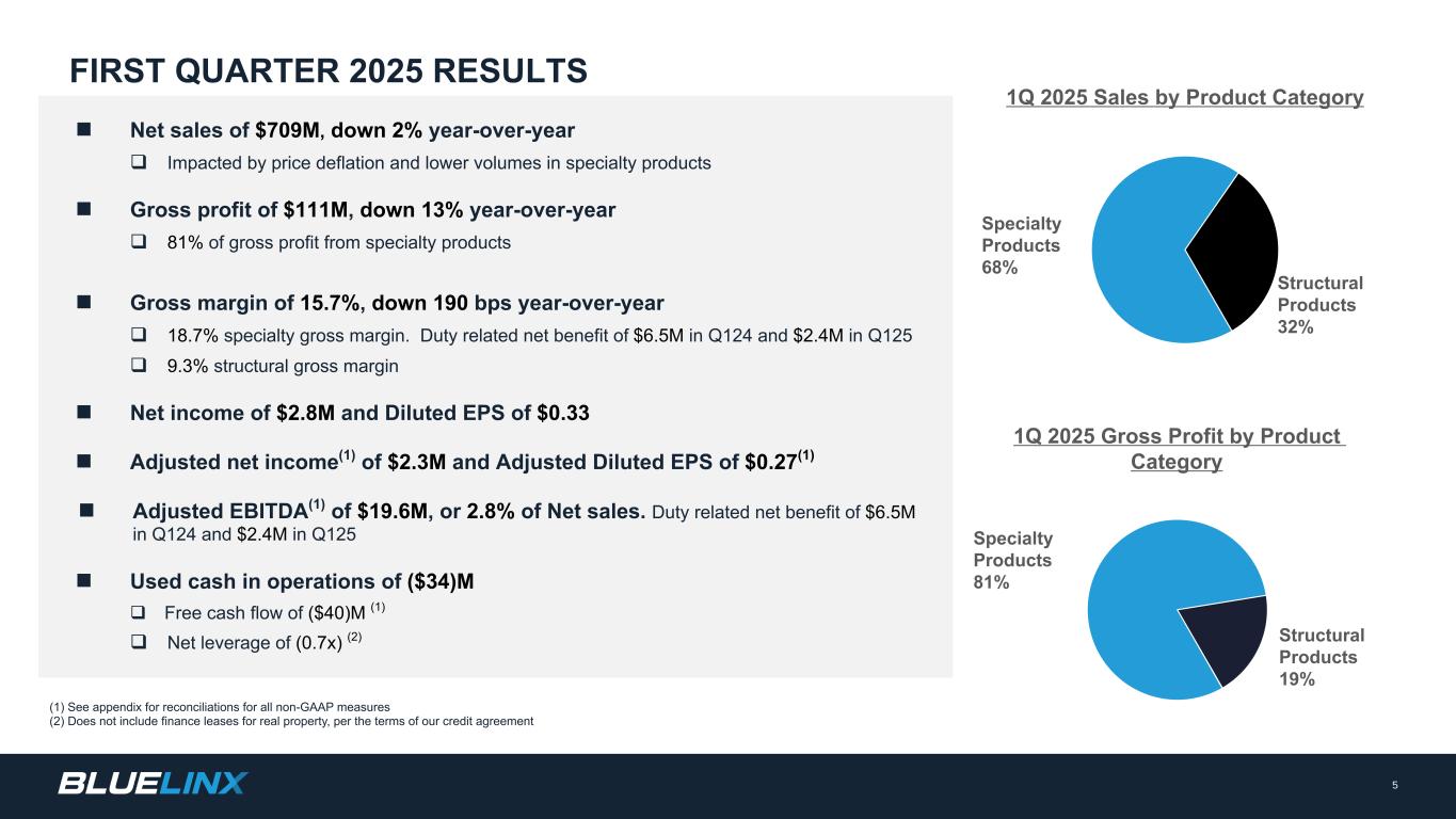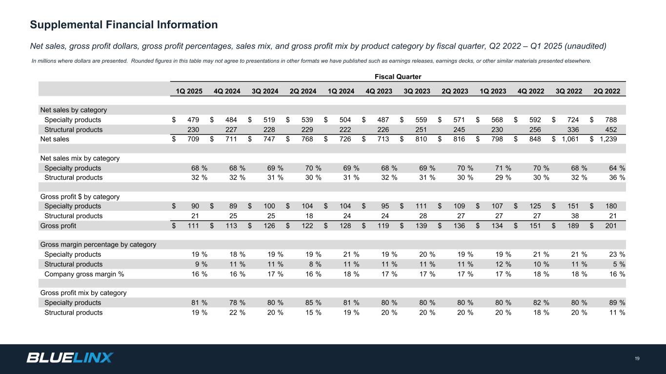 スペシャリティ製品(人工木材、サイディング、木工製品、アウトドアリビング、特殊製材・パネル、工業製品など)の純売上高は、前年同期比2,400万ドル(4.9%)減の4億7,900万ドルでした。当四半期の特殊製品売上高の減少は、外部市況による価格デフレに加え、特殊製品のほとんどのカテゴリーで数量が減少したことによるものです。スペシャリティ製品の売上総利益は9,000万ドルで、前年同期に比べ1,400万ドル(13.7%)減少しました。スペシャリティ製品の売上総利益率は、前年同期の20.7%に対し18.7%と200bp低下しました。当四半期には240万ドル、前年同期には650万ドルの輸入関税関連項目の正味利益が含まれています。これらの利益を除くと、2025年度第1四半期の売上総利益率は18.2%、2024年度第1四半期の売上総利益率は19.4%となり、それぞれ120bp低下した。関税項目は、反ダンピング関税の遡及税率の変更および当社が輸入する特定の商品の分類調整に関連するものであった。
