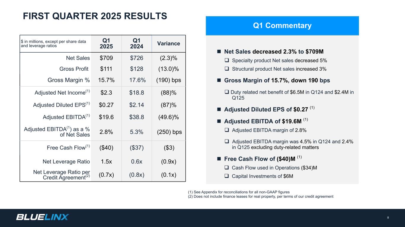 2025 年 4 月 30 日、すでに発表したとおり、BlueLinx は 2025 年 3 月 29 日に終了した会計年度の第 1 四半期の業績について電話会議と音声ウェブキャストを開催します。この電話会議およびウェブ放送で言及される補足資料の写し(当社のウェブサイトに掲載される予定)は、本書の別紙99.2として提供されます。