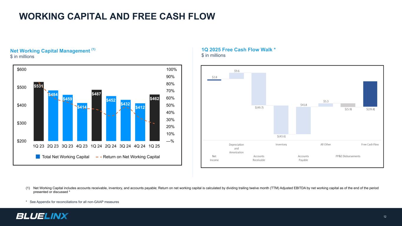 フリーキャッシュフロー。BlueLinxは、フリー・キャッシュ・フローを、営業活動によって得られた、または営業活動に使用された純現金から資本支出総額を差し引いたものと定義しています。フリー・キャッシュ・フローは、経営陣が当社の財務業績を評価するために使用する指標であり、当社の営業キャッシュ・フローと事業運営の継続と改善のために支出される資本を関連付けるため、投資家にとって有用であると考えています。特にフリー・キャッシュ・フローは、資本支出後に創出または使用された現金の額を示しており、特に事業への投資、バランスシートの強化、借入債務の返済に使用することができます。フリー・キャッシュ・フローは、裁量的支出に使用可能な残余キャッシュ・フローを示すものではありません。フリー・キャッシュ・フローはGAAPに準拠した表示ではなく、GAAPに基づいて決定されたものよりも優れた財務状況の指標を示すことを意図したものでもありません。