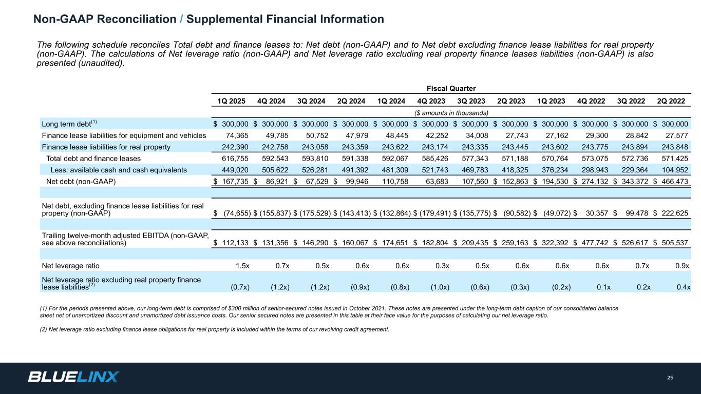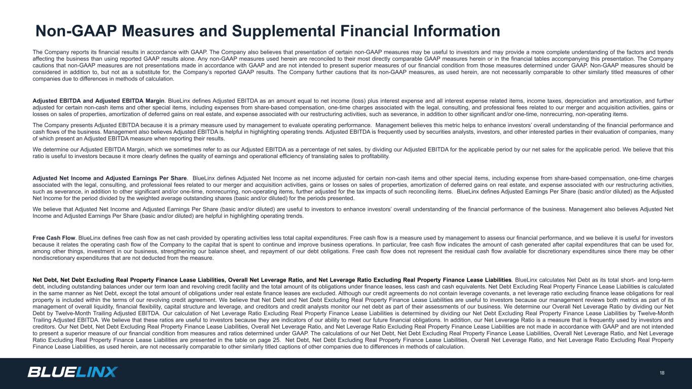 調整後純利益と調整後1株当たり利益。BlueLinxは、調整後純利益を、特定の非現金項目およびその他の特別項目を調整した純利益と定義しています。この特別項目には、株式報酬による費用、M&A活動に関連する弁護士費用、コンサルティング費用、専門家報酬、不動産売却損益、不動産繰延利益の償却費、退職金などのリストラ活動に関連する費用などが含まれます。BlueLinxは、調整後1株当たり利益(基本および/または希薄化後)を、その期間の調整後純利益を、表示された期間の加重平均発行済み株式数(基本および/または希薄化後)で割ったものと定義しています。当社は、調整後純利益と調整後1株当たり利益(基本的および/または希薄化後)は、投資家が事業の財務業績を総合的に理解する上で有用であると考えています。また経営陣は、調整後純利益および調整後1株当たり利益(基本的および/または希薄化後)は、営業トレンドを強調する上で有用であると考えています。