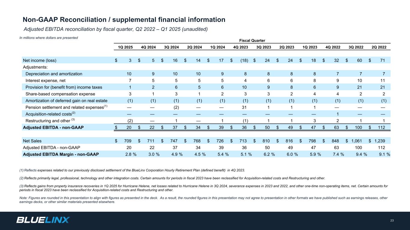 調整後EBITDAと調整後EBITDAマージン。BlueLinxは、調整後EBITDAを、純利益(損失)に支払利息および支払利息に関連するすべての項目、法人税、減価償却費、償却費を加えた金額と定義し、さらに特定の非現金項目およびその他の特別項目(株式報酬による費用、M&A活動に関連する法務、コンサルティング、専門家報酬に関連する一時費用、不動産売却損益、不動産の繰延利益の償却費、退職金などの事業再編活動に関連する費用、その他の重要項目および/または一時的な、経常的でない、営業外項目など)を調整した金額と定義しています。