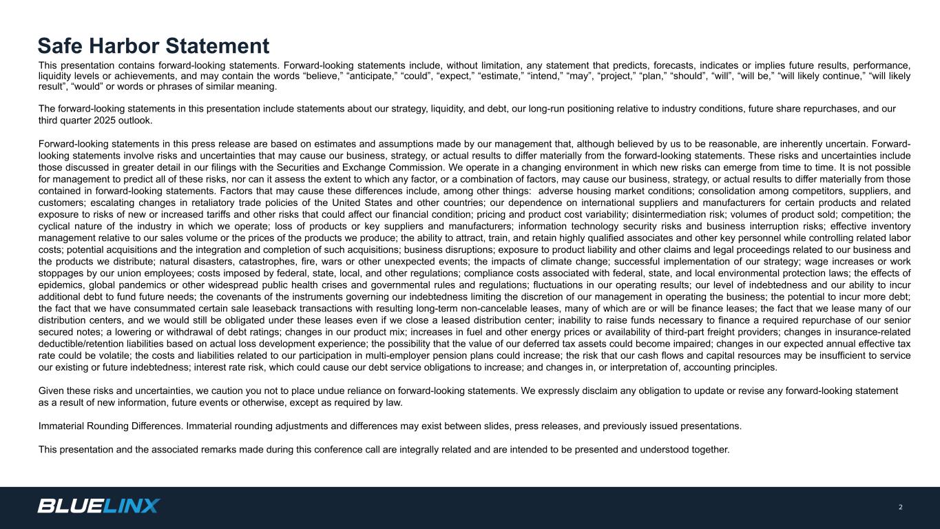 Through the first four weeks of the third quarter of 2025, specialty product gross margin was in the range of 17% to 18% and structural product gross margin was in the range of 8% to 9%. Average daily sales volumes were up slightly compared to the second quarter of 2025, and consistent with the third quarter of 2024.