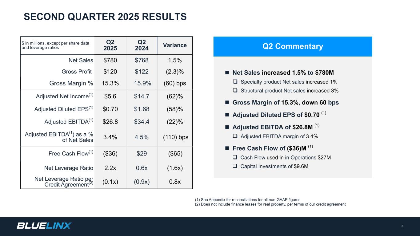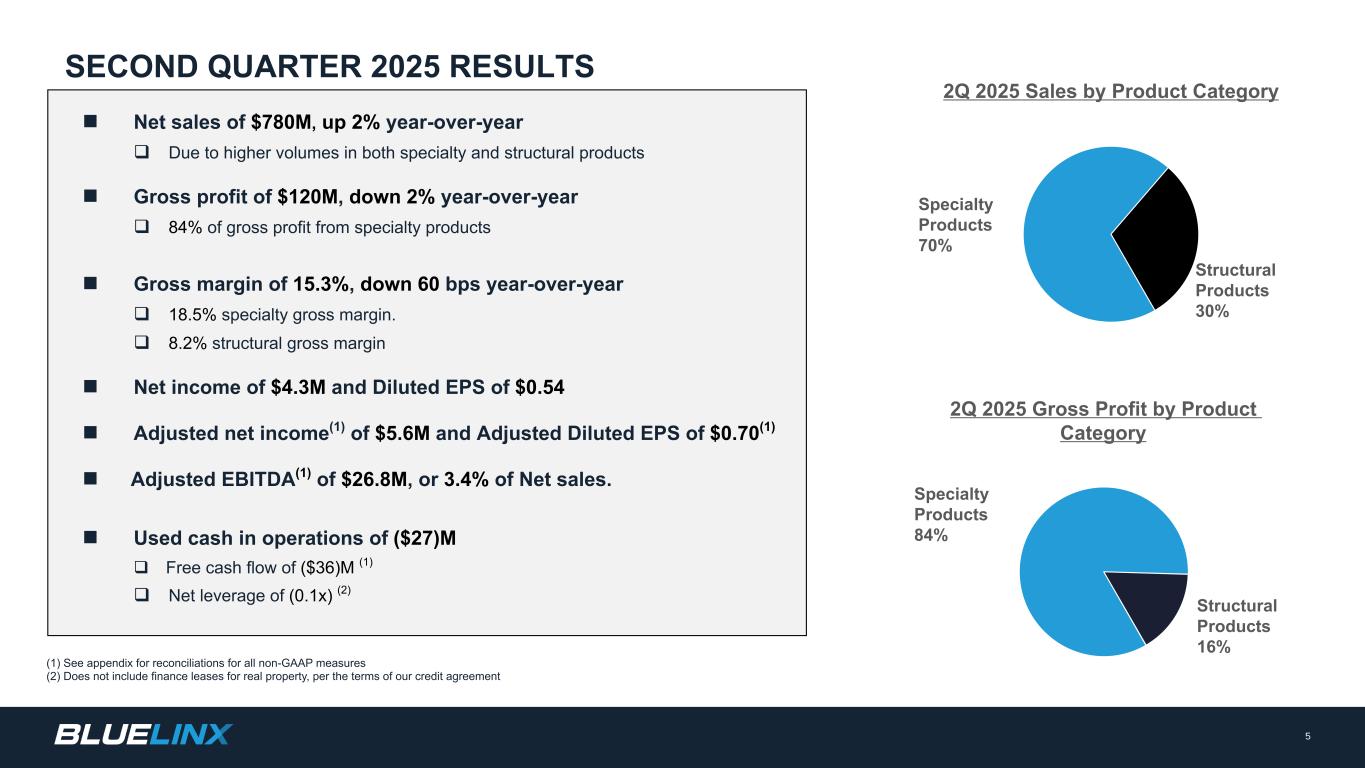 In the second quarter of 2025, net sales were $780 million, an increase of $12 million, or 2% when compared to the second quarter of 2024. Sales growth in the current quarter was attributable to both structural and specialty products. Gross profit was $120 million, a decrease of $3 million, or 2%, year-over-year, and gross margin percentage was 15.3%, down 60 basis points from the same period last year.