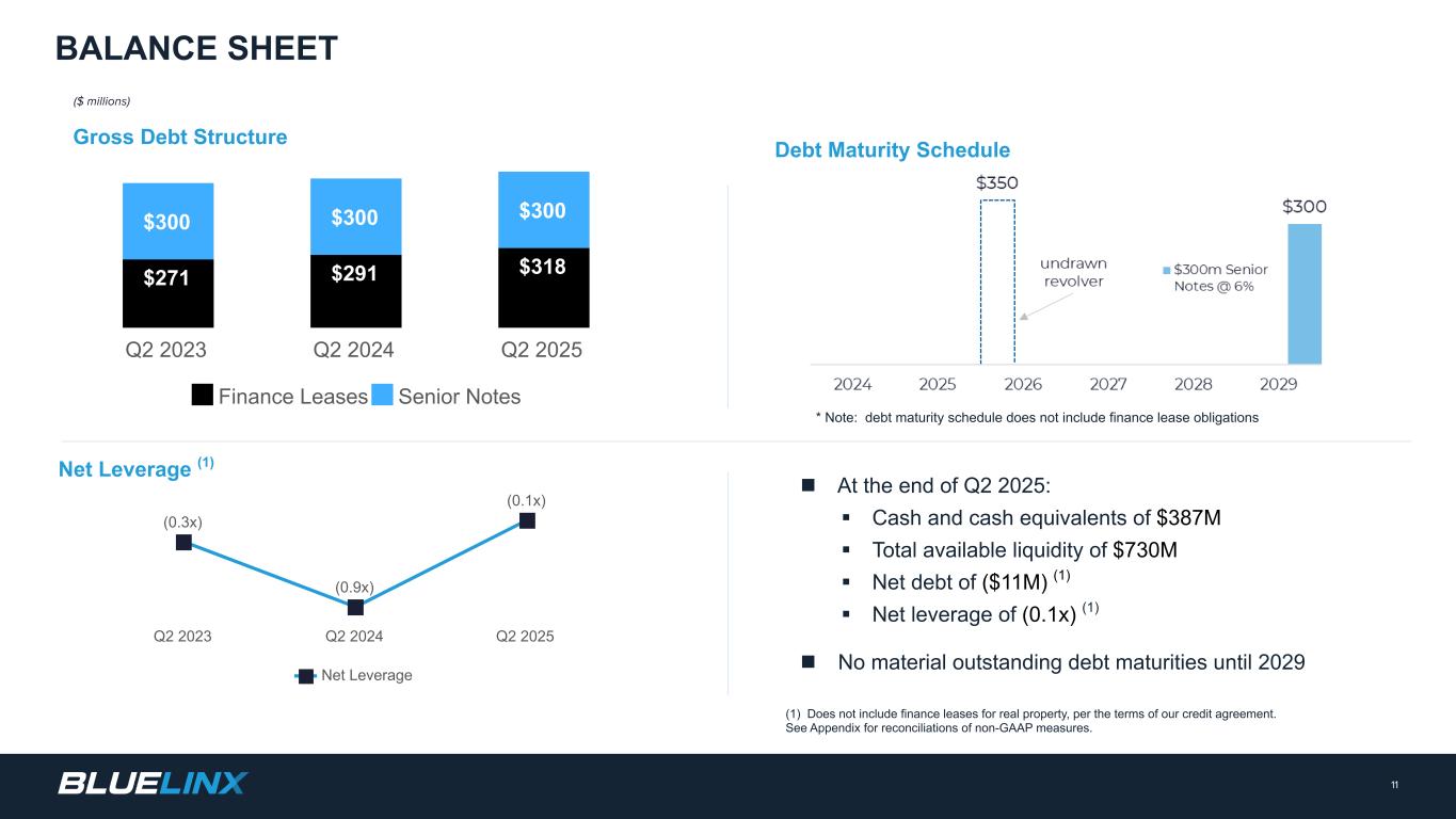 As of June 28, 2025, total debt and finance lease obligations, but excluding real property finance lease obligations, was $376 million. This consisted of $300 million of senior secured notes that mature in 2029 and $76 million of finance lease obligations for equipment. Net debt was ($11) million, which consisted of total debt and finance leases excluding real property finance lease obligations of $376 million, less cash and cash equivalents of $387 million, resulting in a net leverage ratio of (0.1x) using a trailing twelve-month Adjusted EBITDA of $105 million. Available liquidity was $730 million which included an undrawn revolving credit facility that had $343 million of availability plus cash and cash equivalents of $387 million.