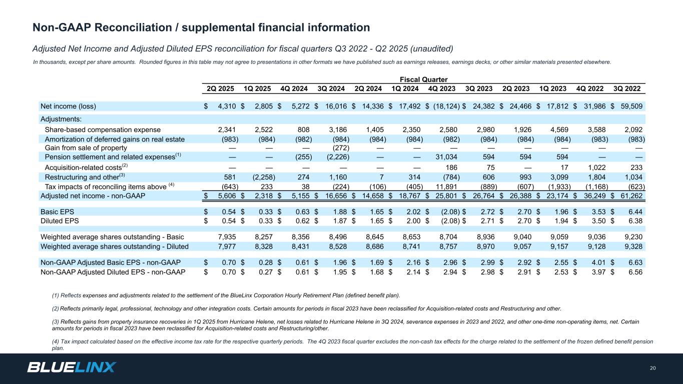 Adjusted Net Income and Adjusted Earnings Per Share. BlueLinx defines Adjusted Net Income as Net Income adjusted for certain non-cash items and other special items, including expenses from share-based compensation, one-time charges associated with the legal, consulting, and professional fees related to our merger and acquisition activities, gains or losses on sales of properties, amortization of deferred gains on real estate, and expense associated with our restructuring activities, such as severance, in addition to other significant and/or one-time, nonrecurring, non-operating items, further adjusted for the tax impacts of such reconciling items. BlueLinx defines Adjusted Earnings Per Share (basic and/or diluted) as the Adjusted Net Income for the period divided by the weighted average outstanding shares (basic and/or diluted) for the periods presented. We believe that Adjusted Net Income and Adjusted Earnings Per Share (basic and/or diluted) are useful to investors to enhance investors’ overall understanding of the financial performance of the business. Management also believes Adjusted Net Income and Adjusted Earnings Per Share (basic and/or diluted) are helpful in highlighting operating trends.