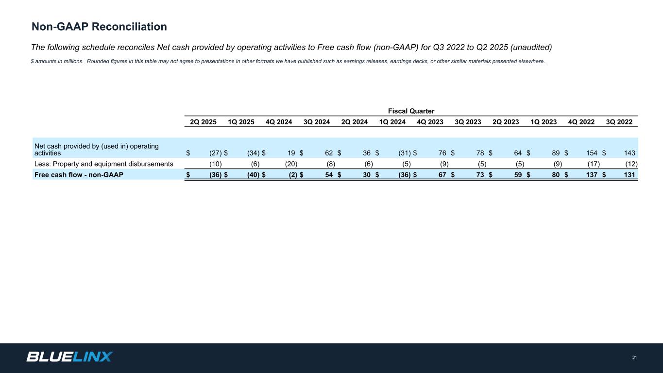 During the second quarter of 2025, we invested $9.9 million in property and equipment, primarily for improvements to our distribution facilities and for our digital transformation initiative. We also entered into new finance leases of $5 million, mainly to enhance our fleet. Additionally, we purchased approximately $20 million of the Company’s common stock through open market transactions under our previous $100 million share repurchase program announced in 2023.