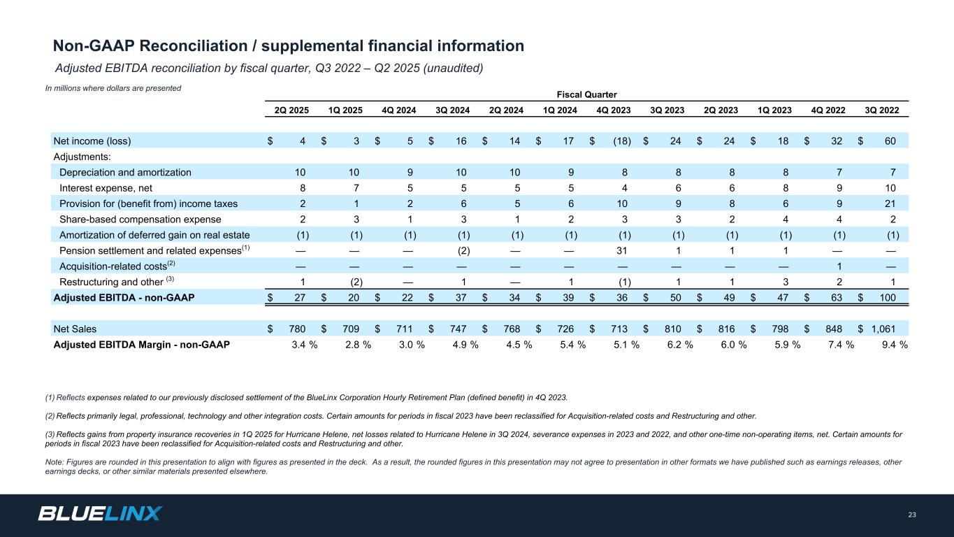 (2)Reflects expenses and related adjustments to our previously disclosed settlement of the BlueLinx Corporation Hourly Retirement Plan (defined benefit) in 4Q 2023.