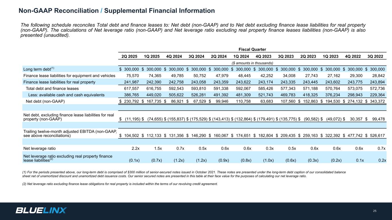 Net Debt, Net Debt Excluding Real Property Finance Lease Liabilities, Overall Net Leverage Ratio, and Net Leverage Ratio Excluding Real Property Finance Lease Liabilities. BlueLinx calculates Net Debt as its total short- and long-term debt, including outstanding balances under our term loan and revolving credit facility and the total amount of its obligations under finance leases, less cash and cash equivalents. Net Debt Excluding Real Property Finance Lease Liabilities is calculated in the same manner as Net Debt, except the total amount of obligations under real estate finance leases are excluded. Although our credit agreements do not contain leverage covenants, a net leverage ratio excluding finance lease obligations for real property is included within the terms of our revolving credit agreement. We believe that Net Debt and Net Debt Excluding Real Property Finance Lease Liabilities are useful to investors because our management reviews both metrics as part of its management of overall liquidity, financial flexibility, capital structure and leverage, and creditors and credit analysts monitor our net debt as part of their assessments of our business. We determine our Overall Net Leverage Ratio by dividing our Net Debt by Twelve-Month Trailing Adjusted EBITDA. Our calculation of Net Leverage Ratio Excluding Real Property Finance Lease Liabilities is determined by dividing our Net Debt Excluding Real Property Finance Lease Liabilities by Twelve-Month Trailing Adjusted EBITDA. We believe that these ratios are useful to investors because they are indicators of our ability to meet our future financial obligations. In addition, our Net Leverage Ratio is a measure that is frequently used by investors and creditors. Our Net Debt, Net Debt Excluding Real Property Finance Lease Liabilities, Overall Net Leverage Ratio, and Net Leverage Ratio Excluding Real Property Finance Lease Liabilities are not made in accordance with GAAP and are not intended to present a superior measure of our financial condition from measures and ratios determined under GAAP. The calculations of our Net Debt, Net Debt Excluding Real Property Finance Lease Liabilities, Overall Net Leverage Ratio, and Net Leverage Ratio Excluding Real Property Finance Lease Liabilities are presented in a subsequent table. Net Debt, Net Debt Excluding Real Property Finance Lease Liabilities, Overall Net Leverage Ratio, and Net Leverage Ratio Excluding Real Property Finance Lease Liabilities, as used herein, are not necessarily comparable to other similarly titled captions of other companies due to differences in methods of calculation.