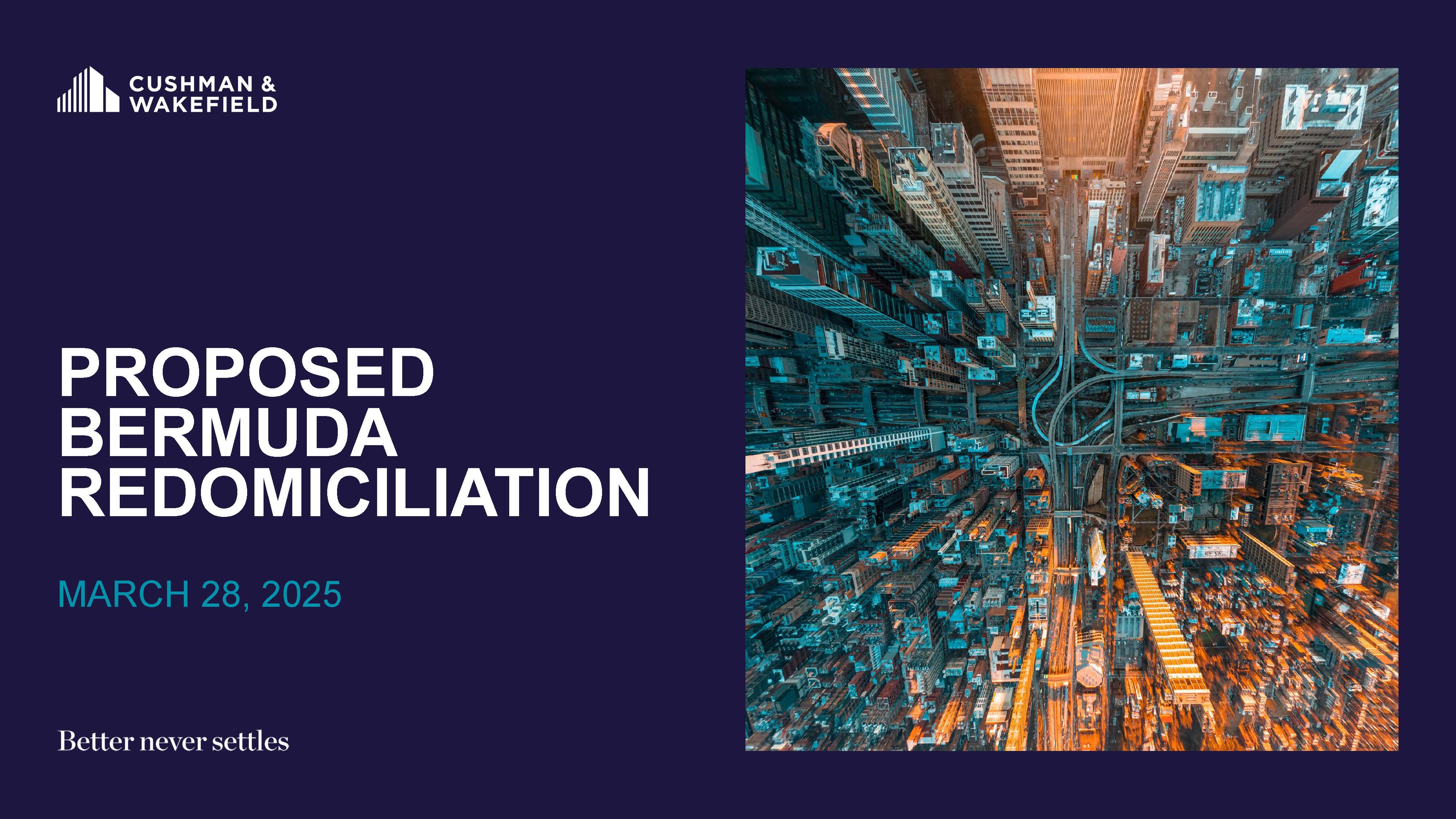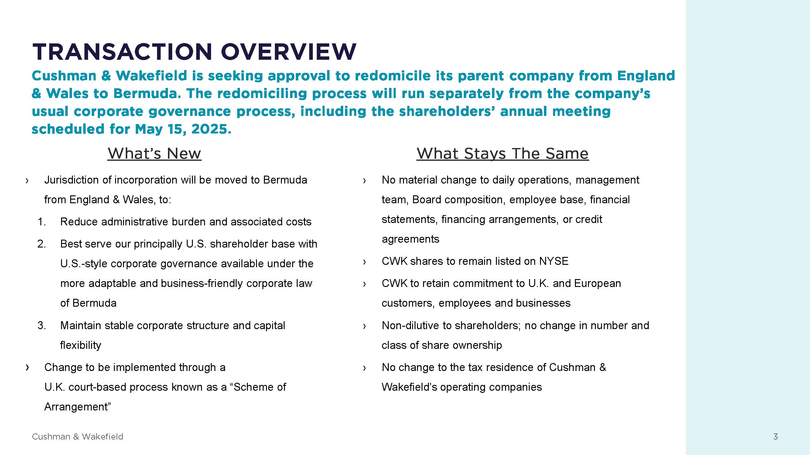 DISCLAIMERS Forward-Looking Statements This presentation contains forward-looking statements. All statements contained in this presentation other than statements of historical fact, including statements relating to the shareholder meetings in connection with the proposed redomiciliation of Cushman & Wakefield plc (“Cushman & Wakefield,” “we,” “our”) from England and Wales to Bermuda (the “Redomiciliation”), the Redomiciliation, trends in or expectations relating to the expected effects of our initiatives, strategies and plans, as well as trends in or expectations regarding our financial results and longterm growth model and drivers, and regarding our business strategy and plans and our objectives for future operations, are forward-looking statements. The words “can,” “believe,” “may,” “will,” “continue,” “anticipate,” “intend,” “plan,” “expect,” “seek” and similar expressions are intended to identify forward-looking statements. We have based these forward-looking statements largely on our current expectations and projections about future events and trends. These statements are subject to a variety of risks and uncertainties that could cause actual results to differ materially from expectations. These risks and uncertainties include, but are not limited to, the risks detailed in our filings with the Securities and Exchange Commission (the “SEC”), including the Risk Factors section of our Annual Report on Form 10-K for the year ended December 31, 2024. New risks emerge from time to time. It is not possible for our management to predict all risks, nor can we assess the impact of all factors on our business or the extent to which any factor, or combination of factors, may cause actual results to differ materially from those contained in any forward-looking statements we may make. In light of these risks, uncertainties and assumptions, the future events and trends discussed in this presentation may not occur and actual results could differ materially and adversely from those anticipated or implied in the forward-looking statements. You should not rely upon forwardlooking statements as predictions of future events. The events and circumstances reflected in the forward-looking statements may not be achieved or occur. Although we believe that the expectations reflected in the forward-looking statements are reasonable, we cannot guarantee future results. We assume no obligation to update any of the forward-looking statements contained in this presentation, except as required by law. Additional Information and Where to Find It This presentation does not constitute an offer to sell or the solicitation of an offer to buy any securities or a solicitation of any vote or approval. This presentation may be deemed to be solicitation material in respect of the Redomiciliation. In connection with the Redomiciliation, on March 28, 2025, Cushman & Wakefield filed with the SEC a preliminary proxy statement and will file with the SEC and mail to its shareholders a definitive proxy statement and scheme circular (the “Definitive Proxy Statement”), as well as other relevant documents regarding the proposed Redomiciliation. CUSHMAN & WAKEFIELD SHAREHOLDERS ARE URGED TO READ THE DEFINITIVE PROXY STATEMENT AS WELL AS ANY AMENDMENTS OR SUPPLEMENTS THERETO AND ANY DOCUMENTS INCORPORATED BY REFERENCE THEREIN AND OTHER RELEVANT DOCUMENTS IN CONNECTION WITH THE PROPOSED TRANSACTION THAT CUSHMAN & WAKEFIELD WILL FILE WITH THE SEC WHEN THEY BECOME AVAILABLE BECAUSE THEY WILL CONTAIN IMPORTANT INFORMATION ABOUT THE REDOMICILATION. Cushman & Wakefield shareholders and investors may obtain free copies of the Definitive Proxy Statement and other relevant materials (when they become available) and other documents filed by Cushman & Wakefield at the SEC’s website at www.sec.gov. Copies of the Definitive Proxy Statement (and other relevant materials when they become available) and the filings that will be incorporated by reference therein may also be obtained, without charge, by contacting Cushman & Wakefield’s Investor Relations team at ir@cushwake.com or +1 (312) 338-7860. Participants in the Solicitation Cushman & Wakefield and its directors, executive officers and certain employees, may be deemed, under SEC rules, to be participants in the solicitation of proxies in respect of the proposed Redomiciliation. Information regarding Cushman & Wakefield’s directors and executive officers is available in its preliminary proxy statement filed with the SEC on March 28, 2025. Other information regarding the participants in the proxy solicitation and a description of their direct and indirect interests, by security holdings or otherwise, will be contained in the Definitive Proxy Statement and other relevant materials to be filed with the SEC (when they become available). These documents can be obtained free of charge from the sources indicated above. Cushman & Wakefield 2 TRANSACTION OVERVIEW Cushman & Wakefield is seeking approval to redomicile its parent company from England & Wales to Bermuda.