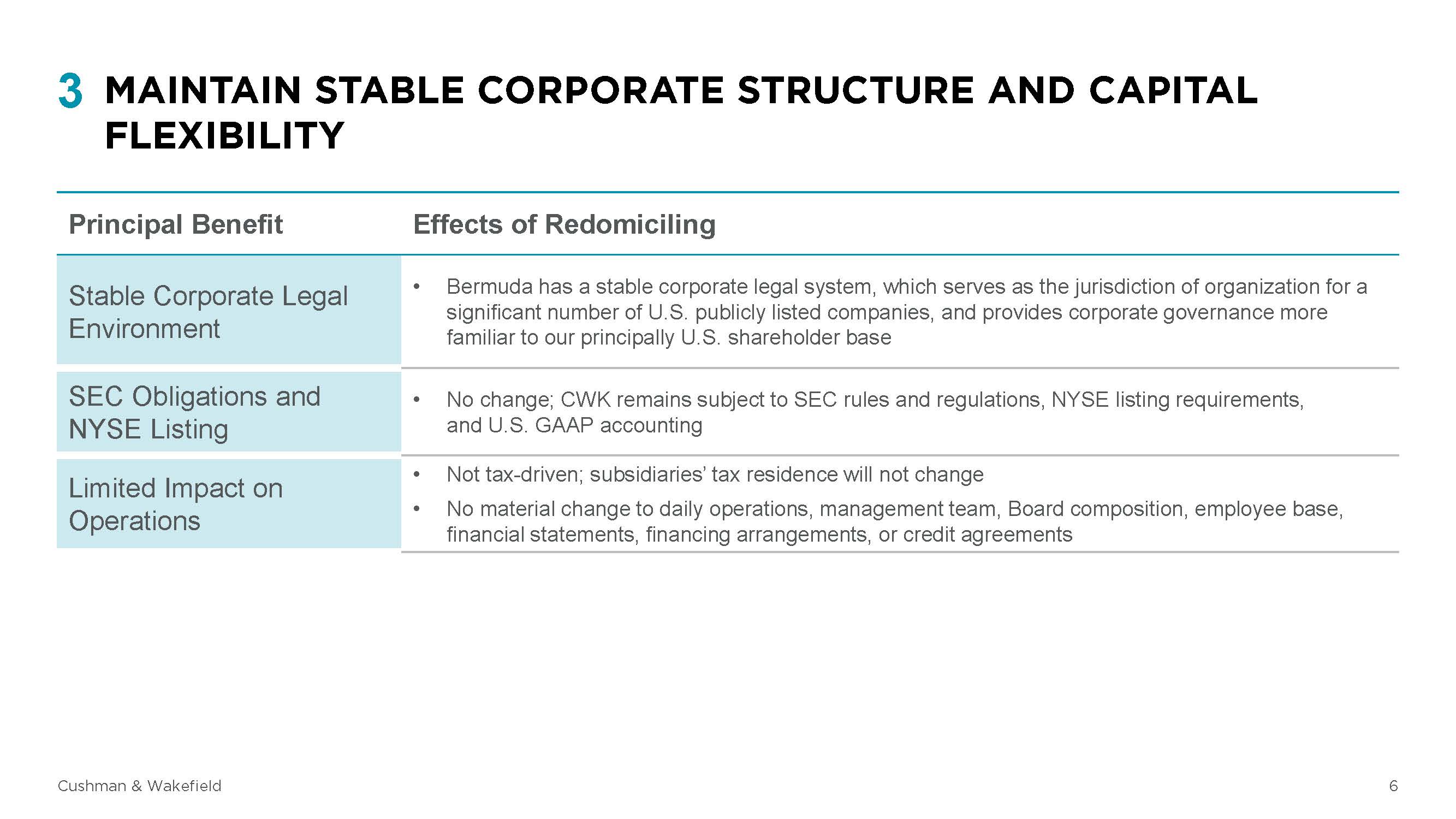 The principal objective of the Redomiciliation is to facilitate shareholder value creation by reducing the administrative burden and associated costs of dual regulation in the U.S. and the U.K. The Redomiciliation would also allow Cushman & Wakefield to align its corporate governance with the expectations of its largely U.S. shareholder base under the more adaptable and business-friendly corporate law of Bermuda, while allowing Cushman & Wakefield to maintain a stable corporate structure and capital flexibility.