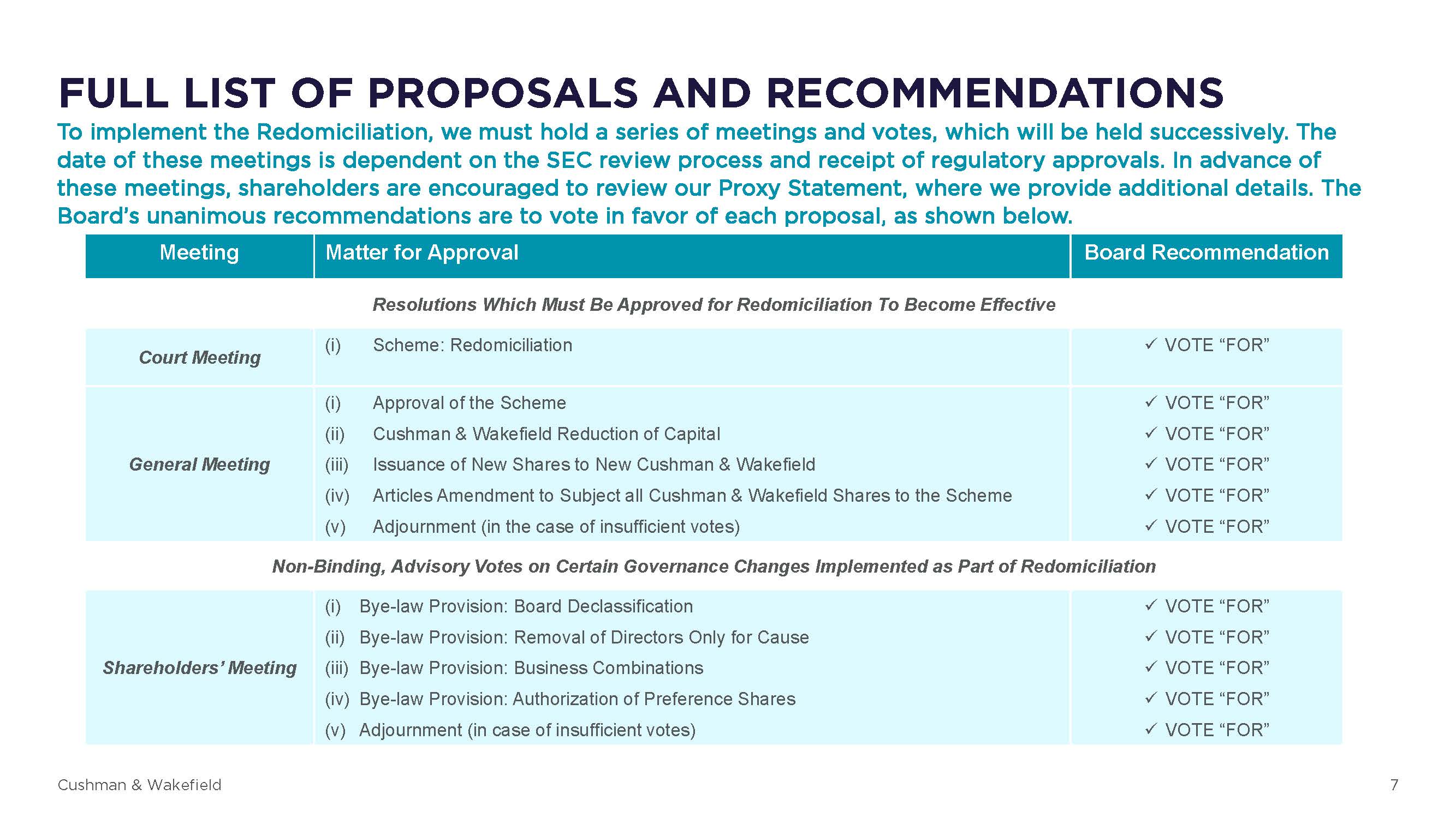 FULL LIST OF PROPOSALS AND RECOMMENDATIONS To implement the Redomiciliation, we must hold a series of meetings and votes, which will be held successively. The date of these meetings is dependent on the SEC review process and receipt of regulatory approvals. In advance of these meetings, shareholders are encouraged to review our Proxy Statement, where we provide additional details. The Board’s unanimous recommendations are to vote in favor of each proposal, as shown below. Meeting Matter for Approval Board Recommendation Resolutions Which Must Be Approved for Redomiciliation To Become Effective Court Meeting (i)Scheme: Redomiciliation „ÏVOTE ¡§FOR¡¨ General Meeting (i)Approval of the Scheme (ii)Cushman & Wakefield Reduction of Capital (iii)Issuance of New Shares to New Cushman & Wakefield (iv)Articles Amendment to Subject all Cushman & Wakefield Shares to the Scheme (v)Adjournment (in the case of insufficient votes) „ÏVOTE ¡§FOR¡¨ „ÏVOTE ¡§FOR¡¨ „ÏVOTE ¡§FOR¡¨ „ÏVOTE ¡§FOR¡¨ „ÏVOTE ¡§FOR¡¨ Non-Binding, Advisory Votes on Certain Governance Changes Implemented as Part of Redomiciliation Shareholders¡¦ Meeting (i)Bye-law Provision: Board Declassification (ii)Bye-law Provision: Removal of Directors Only for Cause (iii)Bye-law Provision: Business Combinations (iv)Bye-law Provision: Authorization of Preference Shares (v)Adjournment (in case of insufficient votes) „ÏVOTE ¡§FOR¡¨ „ÏVOTE ¡§FOR¡¨ „ÏVOTE ¡§FOR¡¨ „ÏVOTE ¡§FOR¡¨ „ÏVOTE ¡§FOR¡¨ Cushman & Wakefield 7 APPENDIX: KEY LEGAL DIFFERENCES & EXPECTED BENEFITS