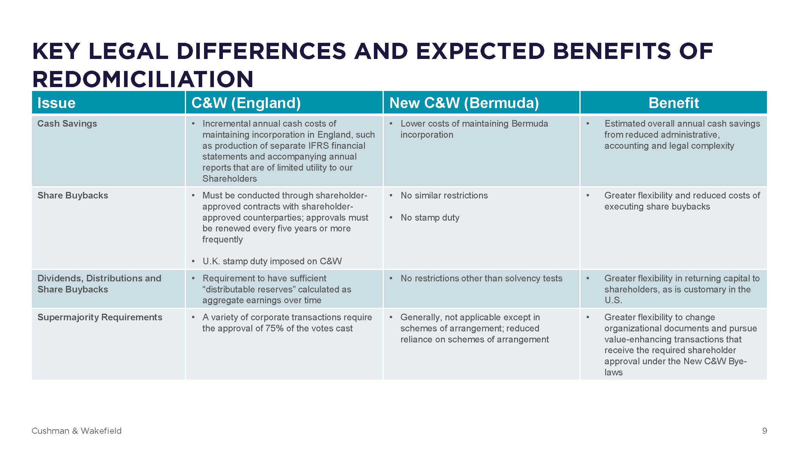 KEY LEGAL DIFFERENCES AND EXPECTED BENEFITS OF REDOMICILIATION Issue C&W (England) New C&W (Bermuda) Benefit Cash Savings •Incremental annual cash costs of maintaining incorporation in England, such as production of separate IFRS financial statements and accompanying annual reports that are of limited utility to our Shareholders •Lower costs of maintaining Bermuda incorporation •Estimated overall annual cash savings from reduced administrative, accounting and legal complexity Share Buybacks •Must be conducted through shareholder-approved contracts with shareholder-approved counterparties; approvals must be renewed every five years or more frequently •U.K. stamp duty imposed on C&W •No similar restrictions •No stamp duty •Greater flexibility and reduced costs of executing share buybacks Dividends, Distributions and Share Buybacks •Requirement to have sufficient “distributable reserves” calculated as aggregate earnings over time •No restrictions other than solvency tests •Greater flexibility in returning capital to shareholders, as is customary in the U.S.