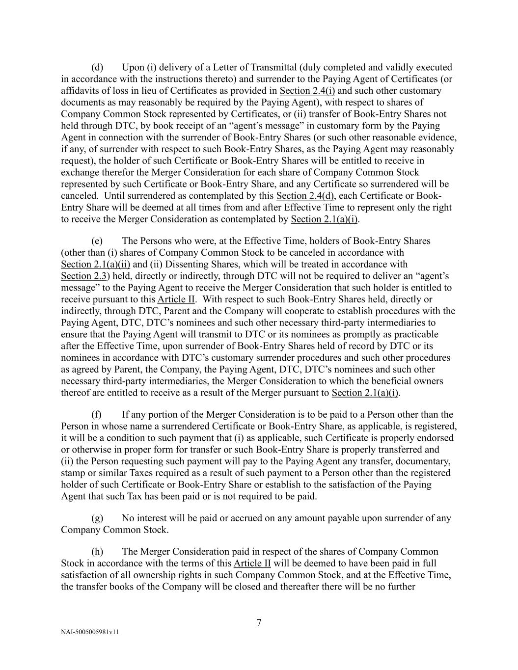 NAI-5005005981v11 7 (d) Upon (i) delivery of a Letter of Transmittal (duly completed and validly executed in accordance with the instructions thereto) and surrender to the Paying Agent of Certificates (or affidavits of loss in lieu of Certificates as provided in Section 2.4(i) and such other customary documents as may reasonably be required by the Paying Agent), with respect to shares of Company Common Stock represented by Certificates, or (ii) transfer of Book-Entry Shares not held through DTC, by book receipt of an “agent’s message” in customary form by the Paying Agent in connection with the surrender of Book-Entry Shares (or such other reasonable evidence, if any, of surrender with respect to such Book-Entry Shares, as the Paying Agent may reasonably request), the holder of such Certificate or Book-Entry Shares will be entitled to receive in exchange therefor the Merger Consideration for each share of Company Common Stock represented by such Certificate or Book-Entry Share, and any Certificate so surrendered will be canceled. Until surrendered as contemplated by this Section 2.4(d), each Certificate or Book- Entry Share will be deemed at all times from and after Effective Time to represent only the right to receive the Merger Consideration as contemplated by Section 2.1(a)(i). (e) The Persons who were, at the Effective Time, holders of Book-Entry Shares (other than (i) shares of Company Common Stock to be canceled in accordance with Section 2.1(a)(ii) and (ii) Dissenting Shares, which will be treated in accordance with Section 2.3) held, directly or indirectly, through DTC will not be required to deliver an “agent’s message” to the Paying Agent to receive the Merger Consideration that such holder is entitled to receive pursuant to this Article II. With respect to such Book-Entry Shares held, directly or indirectly, through DTC, Parent and the Company will cooperate to establish procedures with the Paying Agent, DTC, DTC’s nominees and such other necessary third-party intermediaries to ensure that the Paying Agent will transmit to DTC or its nominees as promptly as practicable after the Effective Time, upon surrender of Book-Entry Shares held of record by DTC or its nominees in accordance with DTC’s customary surrender procedures and such other procedures as agreed by Parent, the Company, the Paying Agent, DTC, DTC’s nominees and such other necessary third-party intermediaries, the Merger Consideration to which the beneficial owners thereof are entitled to receive as a result of the Merger pursuant to Section 2.1(a)(i). (f) If any portion of the Merger Consideration is to be paid to a Person other than the Person in whose name a surrendered Certificate or Book-Entry Share, as applicable, is registered, it will be a condition to such payment that (i) as applicable, such Certificate is properly endorsed or otherwise in proper form for transfer or such Book-Entry Share is properly transferred and (ii) the Person requesting such payment will pay to the Paying Agent any transfer, documentary, stamp or similar Taxes required as a result of such payment to a Person other than the registered holder of such Certificate or Book-Entry Share or establish to the satisfaction of the Paying Agent that such Tax has been paid or is not required to be paid. (g) No interest will be paid or accrued on any amount payable upon surrender of any Company Common Stock. (h) The Merger Consideration paid in respect of the shares of Company Common Stock in accordance with the terms of this Article II will be deemed to have been paid in full satisfaction of all ownership rights in such Company Common Stock, and at the Effective Time, the transfer books of the Company will be closed and thereafter there will be no further