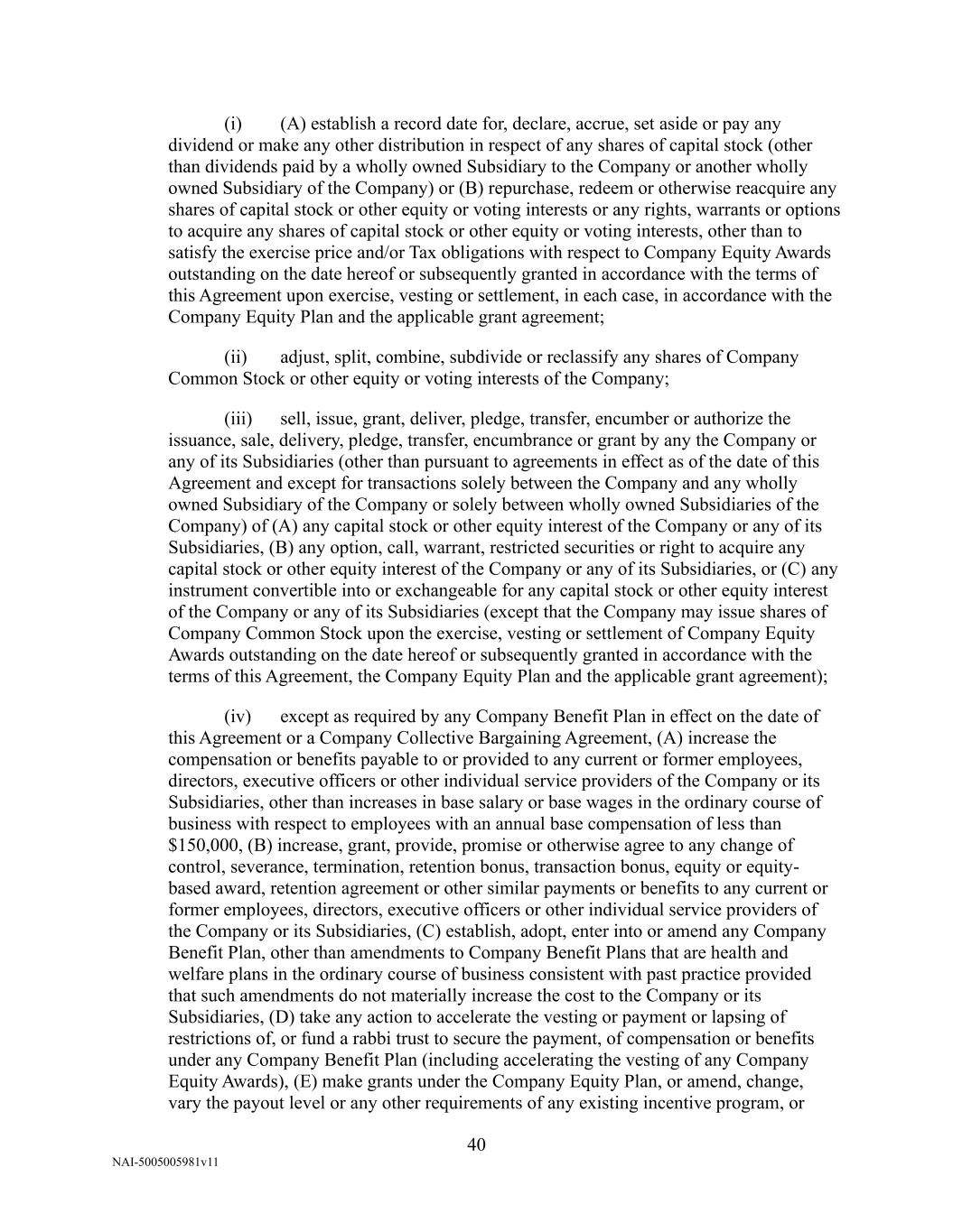 NAI-5005005981v11 40 (i) (A) establish a record date for, declare, accrue, set aside or pay any dividend or make any other distribution in respect of any shares of capital stock (other than dividends paid by a wholly owned Subsidiary to the Company or another wholly owned Subsidiary of the Company) or (B) repurchase, redeem or otherwise reacquire any shares of capital stock or other equity or voting interests or any rights, warrants or options to acquire any shares of capital stock or other equity or voting interests, other than to satisfy the exercise price and/or Tax obligations with respect to Company Equity Awards outstanding on the date hereof or subsequently granted in accordance with the terms of this Agreement upon exercise, vesting or settlement, in each case, in accordance with the Company Equity Plan and the applicable grant agreement; (ii) adjust, split, combine, subdivide or reclassify any shares of Company Common Stock or other equity or voting interests of the Company; (iii) sell, issue, grant, deliver, pledge, transfer, encumber or authorize the issuance, sale, delivery, pledge, transfer, encumbrance or grant by any the Company or any of its Subsidiaries (other than pursuant to agreements in effect as of the date of this Agreement and except for transactions solely between the Company and any wholly owned Subsidiary of the Company or solely between wholly owned Subsidiaries of the Company) of (A) any capital stock or other equity interest of the Company or any of its Subsidiaries, (B) any option, call, warrant, restricted securities or right to acquire any capital stock or other equity interest of the Company or any of its Subsidiaries, or (C) any instrument convertible into or exchangeable for any capital stock or other equity interest of the Company or any of its Subsidiaries (except that the Company may issue shares of Company Common Stock upon the exercise, vesting or settlement of Company Equity Awards outstanding on the date hereof or subsequently granted in accordance with the terms of this Agreement, the Company Equity Plan and the applicable grant agreement); (iv) except as required by any Company Benefit Plan in effect on the date of this Agreement or a Company Collective Bargaining Agreement, (A) increase the compensation or benefits payable to or provided to any current or former employees, directors, executive officers or other individual service providers of the Company or its Subsidiaries, other than increases in base salary or base wages in the ordinary course of business with respect to employees with an annual base compensation of less than $150,000, (B) increase, grant, provide, promise or otherwise agree to any change of control, severance, termination, retention bonus, transaction bonus, equity or equity- based award, retention agreement or other similar payments or benefits to any current or former employees, directors, executive officers or other individual service providers of the Company or its Subsidiaries, (C) establish, adopt, enter into or amend any Company Benefit Plan, other than amendments to Company Benefit Plans that are health and welfare plans in the ordinary course of business consistent with past practice provided that such amendments do not materially increase the cost to the Company or its Subsidiaries, (D) take any action to accelerate the vesting or payment or lapsing of restrictions of, or fund a rabbi trust to secure the payment, of compensation or benefits under any Company Benefit Plan (including accelerating the vesting of any Company Equity Awards), (E) make grants under the Company Equity Plan, or amend, change, vary the payout level or any other requirements of any existing incentive program, or