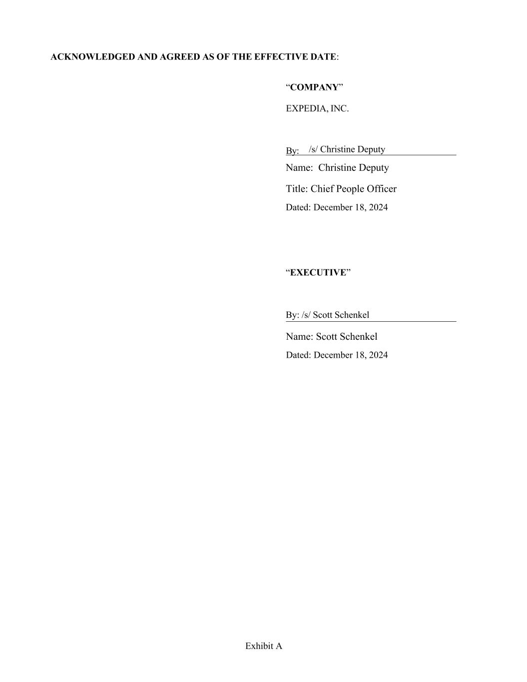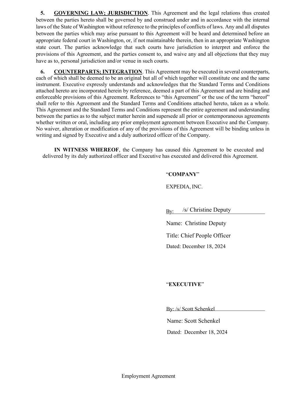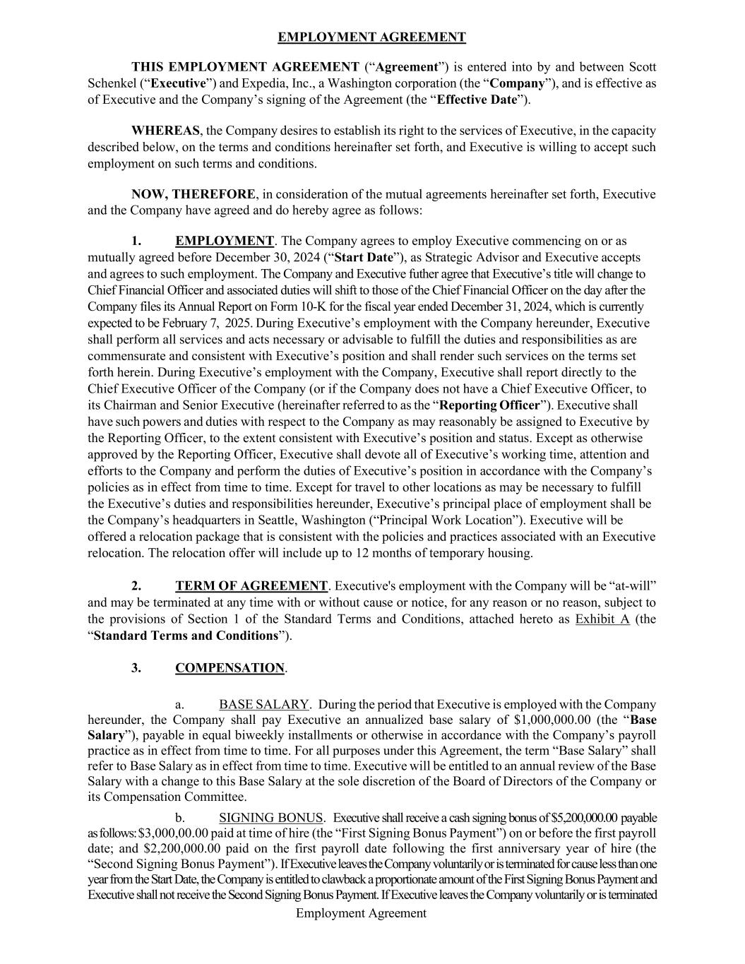 Employment Agreement EMPLOYMENT AGREEMENT THIS EMPLOYMENT AGREEMENT (“Agreement”) is entered into by and between Scott Schenkel (“Executive”) and Expedia, Inc., a Washington corporation (the “Company”), and is effective as of Executive and the Company’s signing of the Agreement (the “Effective Date”). WHEREAS, the Company desires to establish its right to the services of Executive, in the capacity described below, on the terms and conditions hereinafter set forth, and Executive is willing to accept such employment on such terms and conditions. NOW, THEREFORE, in consideration of the mutual agreements hereinafter set forth, Executive and the Company have agreed and do hereby agree as follows: 1. EMPLOYMENT. The Company agrees to employ Executive commencing on or as mutually agreed before December 30, 2024 (“Start Date”), as Strategic Advisor and Executive accepts and agrees to such employment. The Company and Executive futher agree that Executive’s title will change to Chief Financial Officer and associated duties will shift to those of the Chief Financial Officer on the day after the Company files its Annual Report on Form 10-K for the fiscal year ended December 31, 2024, which is currently expected to be February 7, 2025. During Executive’s employment with the Company hereunder, Executive shall perform all services and acts necessary or advisable to fulfill the duties and responsibilities as are commensurate and consistent with Executive’s position and shall render such services on the terms set forth herein. During Executive’s employment with the Company, Executive shall report directly to the Chief Executive Officer of the Company (or if the Company does not have a Chief Executive Officer, to its Chairman and Senior Executive (hereinafter referred to as the “Reporting Officer”). Executive shall have such powers and duties with respect to the Company as may reasonably be assigned to Executive by the Reporting Officer, to the extent consistent with Executive’s position and status. Except as otherwise approved by the Reporting Officer, Executive shall devote all of Executive’s working time, attention and efforts to the Company and perform the duties of Executive’s position in accordance with the Company’s policies as in effect from time to time. Except for travel to other locations as may be necessary to fulfill the Executive’s duties and responsibilities hereunder, Executive’s principal place of employment shall be the Company’s headquarters in Seattle, Washington (“Principal Work Location”). Executive will be offered a relocation package that is consistent with the policies and practices associated with an Executive relocation. The relocation offer will include up to 12 months of temporary housing. 2. TERM OF AGREEMENT. Executive's employment with the Company will be “at-will” and may be terminated at any time with or without cause or notice, for any reason or no reason, subject to the provisions of Section 1 of the Standard Terms and Conditions, attached hereto as Exhibit A (the “Standard Terms and Conditions”). 3. COMPENSATION. a. BASE SALARY. During the period that Executive is employed with the Company hereunder, the Company shall pay Executive an annualized base salary of $1,000,000.00 (the “Base Salary”), payable in equal biweekly installments or otherwise in accordance with the Company’s payroll practice as in effect from time to time. For all purposes under this Agreement, the term “Base Salary” shall refer to Base Salary as in effect from time to time. Executive will be entitled to an annual review of the Base Salary with a change to this Base Salary at the sole discretion of the Board of Directors of the Company or its Compensation Committee. b. SIGNING BONUS. Executive shall receive a cash signing bonus of $5,200,000.00 payable as follows: $3,000,00.00 paid at time of hire (the “First Signing Bonus Payment”) on or before the first payroll date; and $2,200,000.00 paid on the first payroll date following the first anniversary year of hire (the “Second Signing Bonus Payment”). If Executive leaves the Company voluntarily or is terminated for cause less than one year from the Start Date, the Company is entitled to clawback a proportionate amount of the First Signing Bonus Payment and Executive shall not receive the Second Signing Bonus Payment. If Executive leaves the Company voluntarily or is terminated