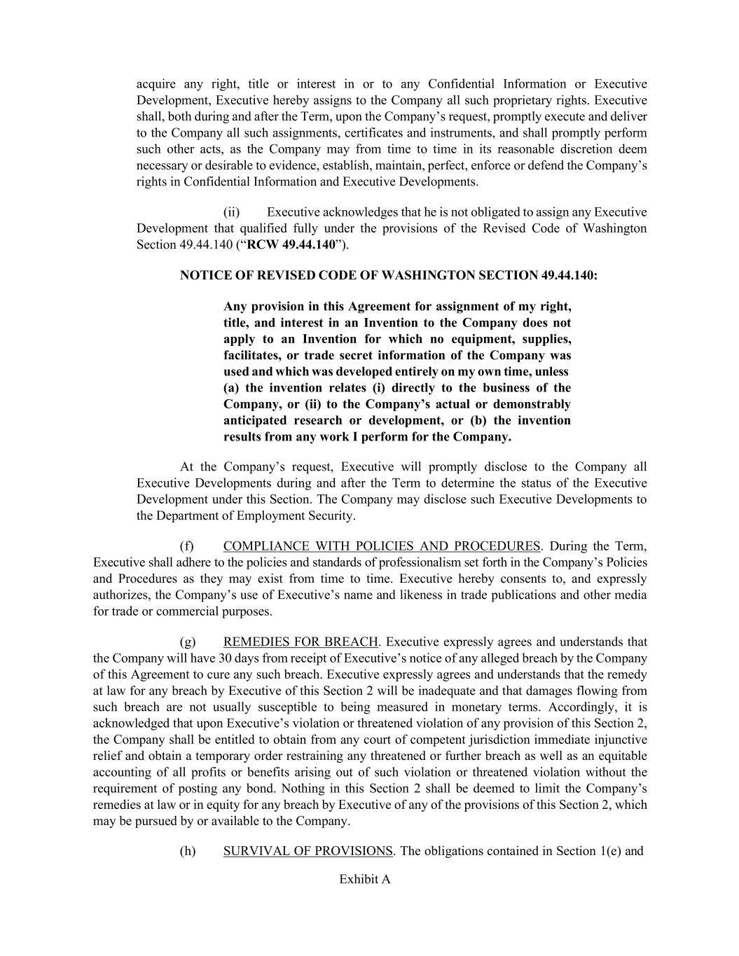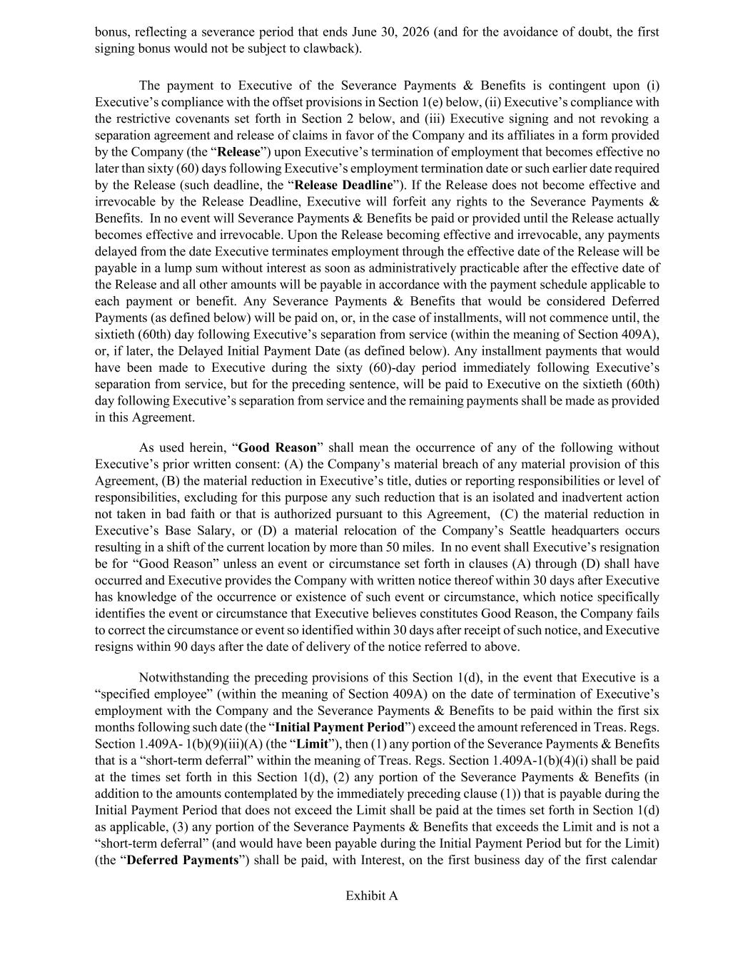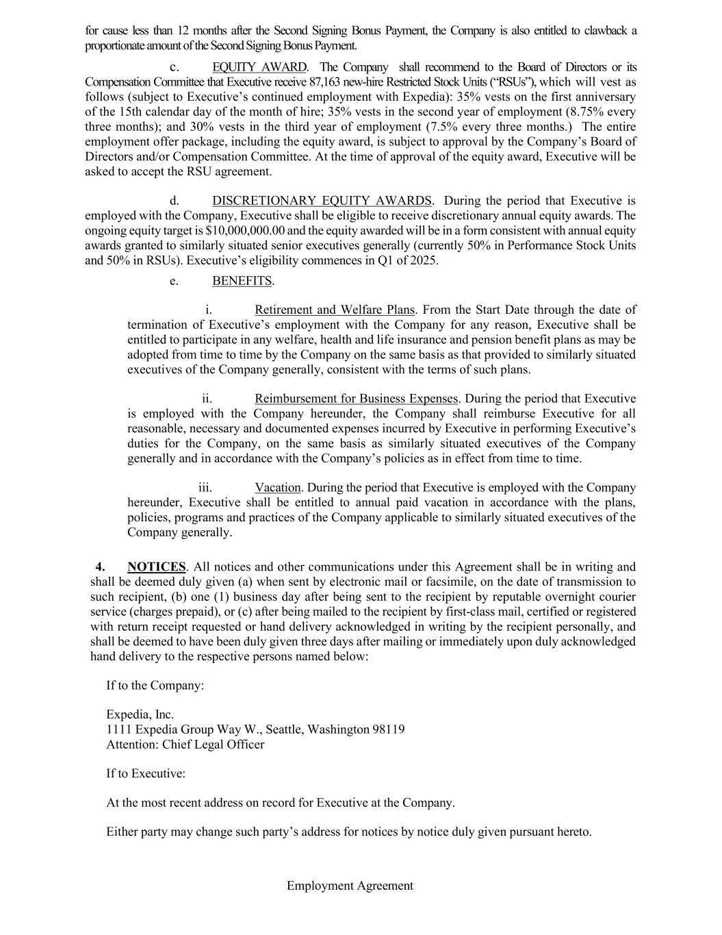 Employment Agreement for cause less than 12 months after the Second Signing Bonus Payment, the Company is also entitled to clawback a proportionate amount of the Second Signing Bonus Payment. c. EQUITY AWARD. The Company shall recommend to the Board of Directors or its Compensation Committee that Executive receive 87,163 new-hire Restricted Stock Units (“RSUs”), which will vest as follows (subject to Executive’s continued employment with Expedia): 35% vests on the first anniversary of the 15th calendar day of the month of hire; 35% vests in the second year of employment (8.75% every three months); and 30% vests in the third year of employment (7.5% every three months.) The entire employment offer package, including the equity award, is subject to approval by the Company’s Board of Directors and/or Compensation Committee. At the time of approval of the equity award, Executive will be asked to accept the RSU agreement. d. DISCRETIONARY EQUITY AWARDS. During the period that Executive is employed with the Company, Executive shall be eligible to receive discretionary annual equity awards. The ongoing equity target is $10,000,000.00 and the equity awarded will be in a form consistent with annual equity awards granted to similarly situated senior executives generally (currently 50% in Performance Stock Units and 50% in RSUs). Executive’s eligibility commences in Q1 of 2025. e. BENEFITS. i. Retirement and Welfare Plans. From the Start Date through the date of termination of Executive’s employment with the Company for any reason, Executive shall be entitled to participate in any welfare, health and life insurance and pension benefit plans as may be adopted from time to time by the Company on the same basis as that provided to similarly situated executives of the Company generally, consistent with the terms of such plans. ii. Reimbursement for Business Expenses. During the period that Executive is employed with the Company hereunder, the Company shall reimburse Executive for all reasonable, necessary and documented expenses incurred by Executive in performing Executive’s duties for the Company, on the same basis as similarly situated executives of the Company generally and in accordance with the Company’s policies as in effect from time to time. iii. Vacation. During the period that Executive is employed with the Company hereunder, Executive shall be entitled to annual paid vacation in accordance with the plans, policies, programs and practices of the Company applicable to similarly situated executives of the Company generally. 4. NOTICES. All notices and other communications under this Agreement shall be in writing and shall be deemed duly given (a) when sent by electronic mail or facsimile, on the date of transmission to such recipient, (b) one (1) business day after being sent to the recipient by reputable overnight courier service (charges prepaid), or (c) after being mailed to the recipient by first-class mail, certified or registered with return receipt requested or hand delivery acknowledged in writing by the recipient personally, and shall be deemed to have been duly given three days after mailing or immediately upon duly acknowledged hand delivery to the respective persons named below: If to the Company: Expedia, Inc. 1111 Expedia Group Way W., Seattle, Washington 98119 Attention: Chief Legal Officer If to Executive: At the most recent address on record for Executive at the Company. Either party may change such party’s address for notices by notice duly given pursuant hereto.