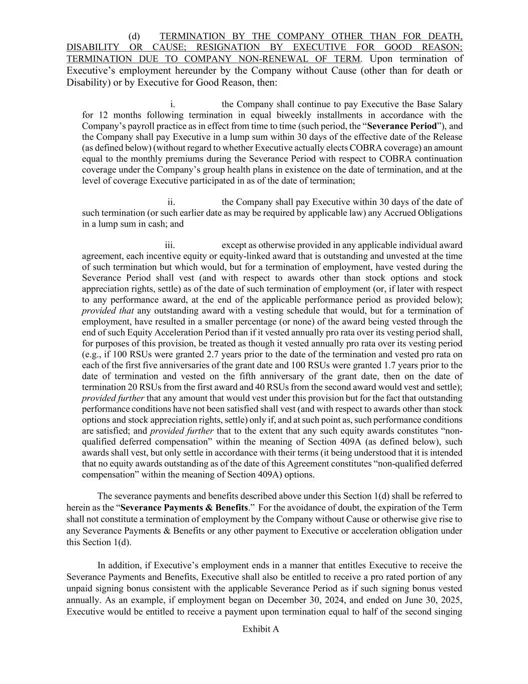 契約ボーナス。シェンケル氏は、開始日に 3,000,000 ドルの初回契約ボーナスを受け取り、2025 年 12 月 15 日に 2,200,000 ドルの追加契約ボーナスを受け取ります。シェンケル氏の解雇理由 (死亡または障害を理由とする場合を除く) による解雇、または正当な理由なく解雇された場合、会社は支払われた契約ボーナスの比例額を取り返す権利を有します。