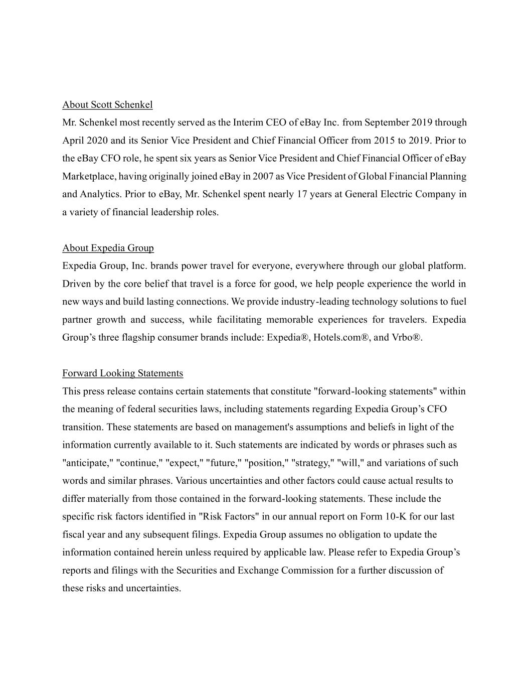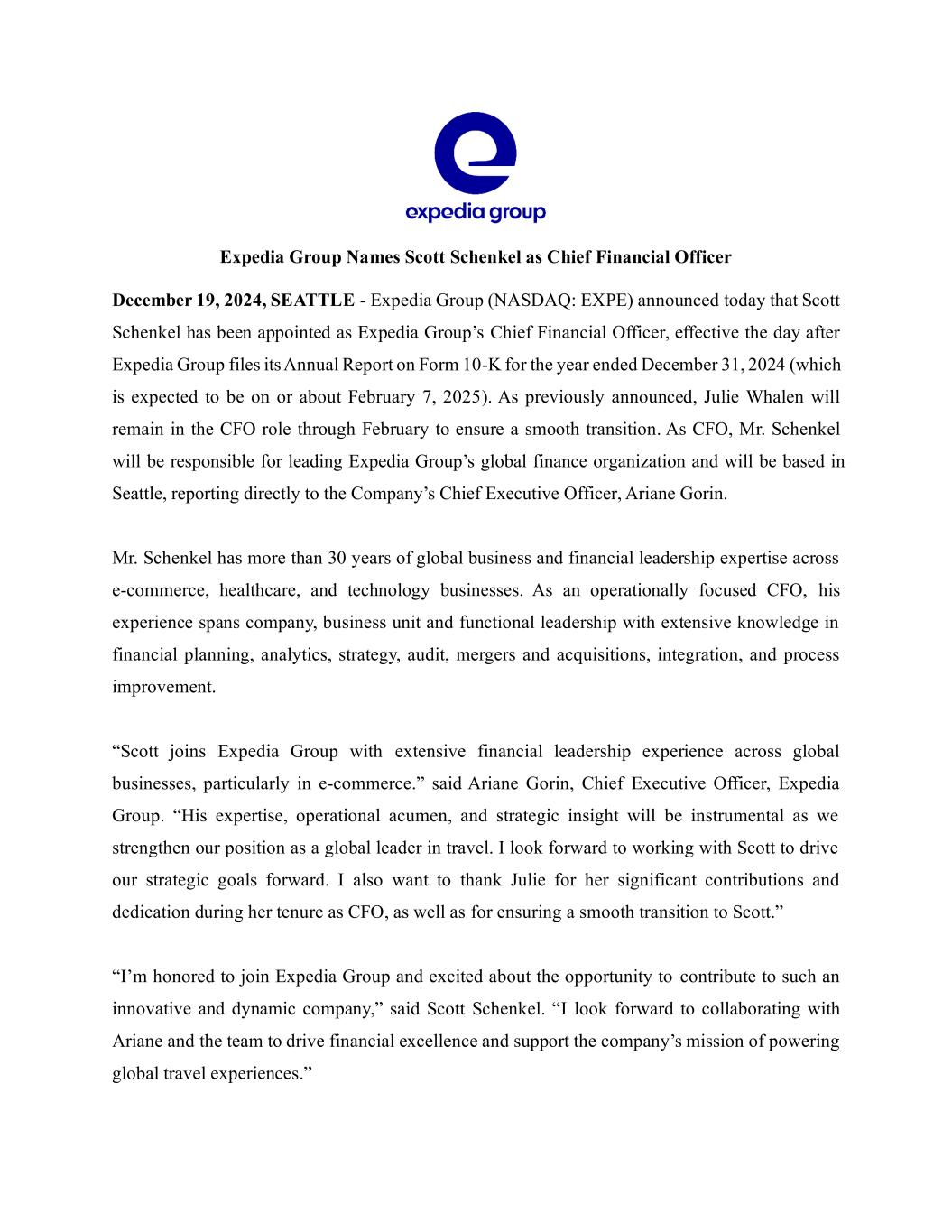2024年12月19日、エクスペディア・グループ・インク(以下「当社」)は、2024年12月31日に終了する会計年度の年次報告書(Form 10-K)を当社が提出した翌日(以下「移行日」)付で、スコット・シェンケル氏を当社の最高財務責任者(CFO)に任命することを発表しました。シェンケル氏は、当社の完全子会社であるエクスペディア・インク(以下、「エクスペディア」)での雇用が2024年12月30日(以下、「開始日」)に開始される予定であり、すでに発表したとおり、ジュリー・ウォーレン氏は移行日まで引き続き当社の最高財務責任者を務めます。