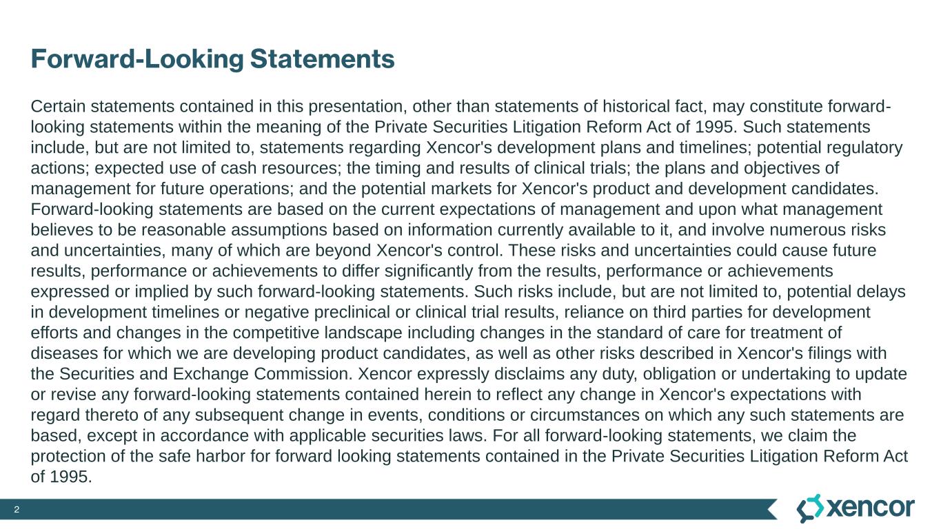 Certain statements contained in this press release may constitute forward-looking statements within the meaning of applicable securities laws. Forward-looking statements include statements that are not purely statements of historical fact, and can generally be identified by the use of words such as “potential,” “can,” “will,” “plan,” “may,” “could,” “would,” “expect,” “anticipate,” “seek,” “look forward,” “believe,” “committed,” “investigational,” “indicates,” “supports,” and similar terms, or by express or implied discussions relating to Xencor’s business, including, but not limited to, statements regarding expectations for clinical progress, planned presentations of clinical data, new XmAb candidates and programs, planned and in process clinical trials, the quotations from Xencor's president and chief executive officer, and other statements that are not purely statements of historical fact. Such statements are made on the basis of the current beliefs, expectations, and assumptions of the management of Xencor and are subject to significant known and unknown risks, uncertainties and other factors that may cause actual results, performance or achievements and the timing of events to be materially different from those implied by such statements, and therefore these statements should not be read as guarantees of future performance or results. Such risks include, without limitation, the risks associated with the process of discovering, developing, manufacturing and commercializing drugs that are safe and effective for use as human therapeutics and other risks, including the ability of publicly disclosed preliminary clinical trial data to support continued clinical development and regulatory approval for specific treatments and the risks, uncertainties and other factors described under the heading “Risk Factors” in Xencor's annual report on Form 10-K for the year ended December 31, 2024 as well as Xencor's subsequent filings with the Securities and Exchange Commission. You are cautioned not to place undue reliance on these forward-looking statements, which speak only as of the date hereof. This caution is made under the safe harbor provisions of the Private Securities Litigation Reform Act of 1995, as amended to date. All forward-looking statements are qualified in their entirety by this cautionary statement and Xencor undertakes no obligation to revise or update these forward-looking statements to reflect events or circumstances after the date hereof, except as required by law.