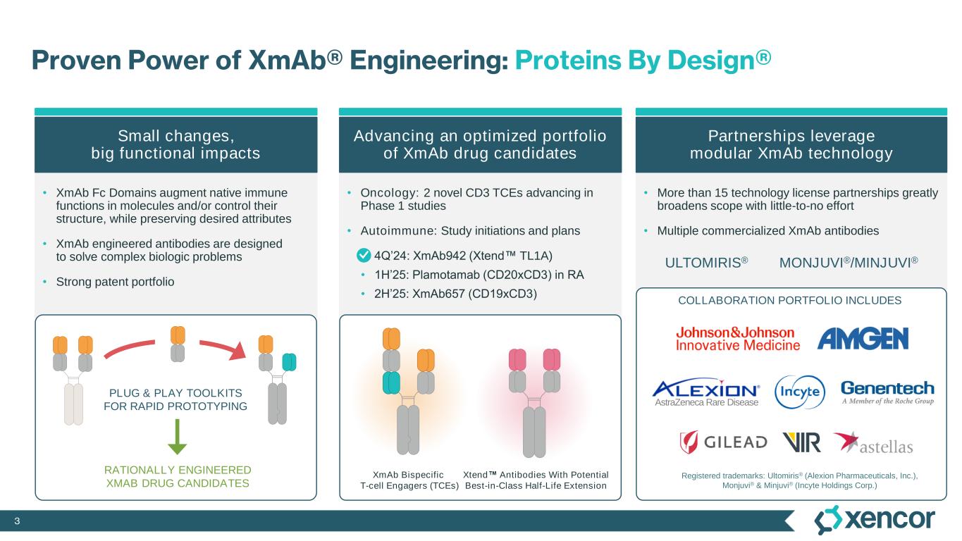 Xencor is a clinical-stage biopharmaceutical company developing engineered antibodies for the treatment of patients with cancer and autoimmune diseases. More than 20 candidates engineered with Xencor's XmAb® technology are in clinical development, and multiple XmAb medicines are marketed by partners. Xencor's XmAb engineering technology enables small changes to a protein’s structure that result in new mechanisms of therapeutic action. For more information, please visit www.xencor.com.