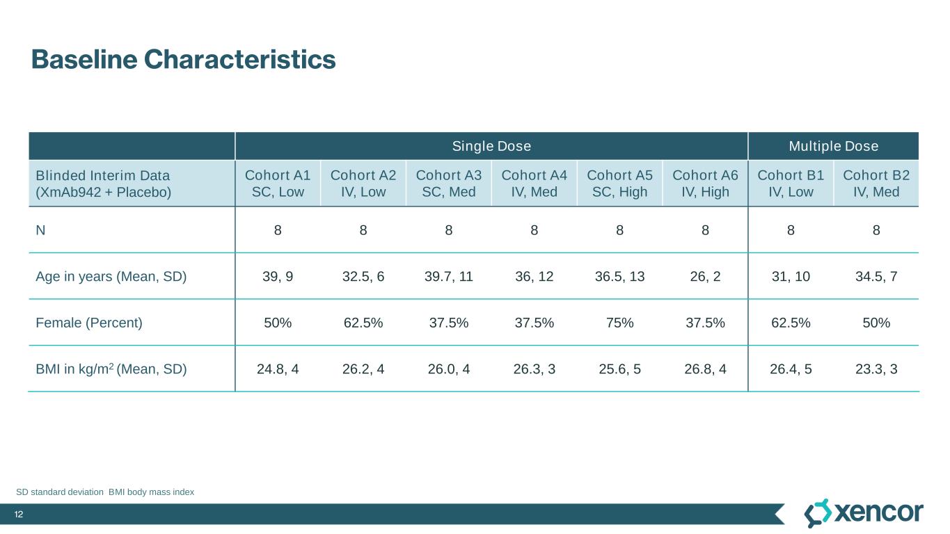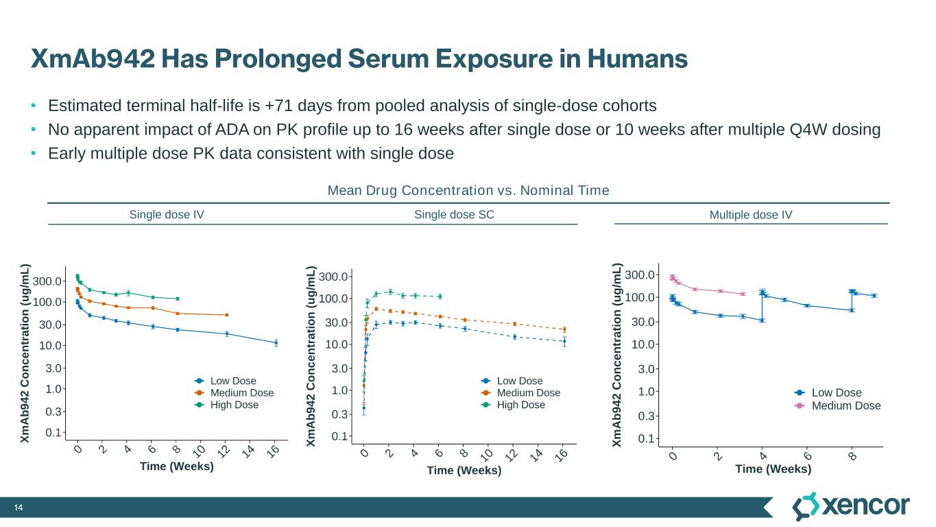 •Immunogenicity: Early pharmacokinetic analysis of single and multiple dose cohorts shows no apparent evidence of anti-drug antibodies emerging against XmAb942.