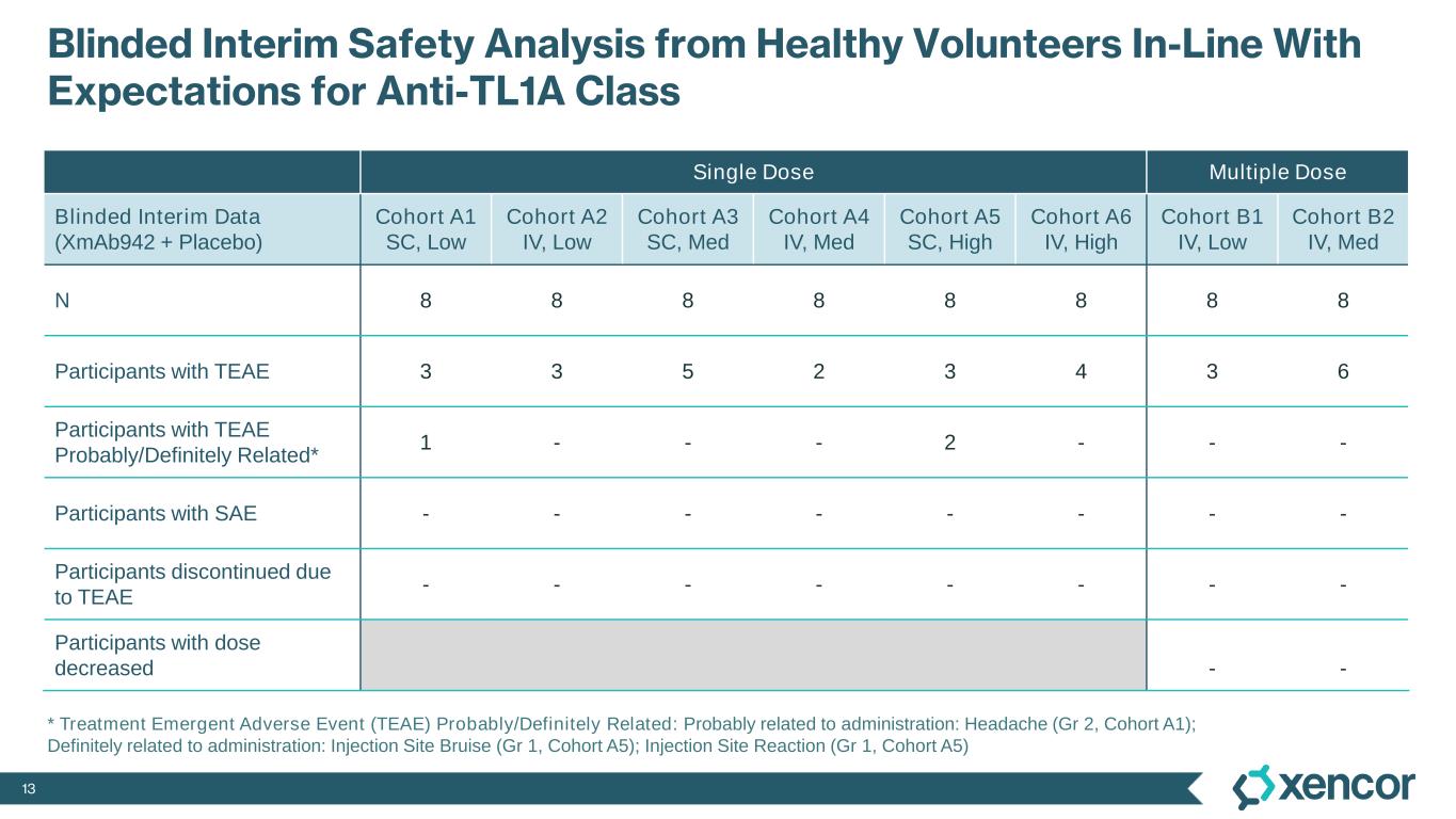 -- Single and multiple doses of XmAb942 are well tolerated and safety profile is consistent with the anti-TL1A drug class --