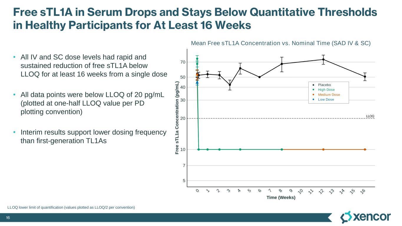 •Pharmacodynamics: Consistent with XmAb942’s high-potency and extended exposure design, large and durable dose-dependent increases of total TL1A in circulation were observed in both IV and SC cohorts. Circulating free TL1A was reduced significantly compared to placebo for all cohorts.
