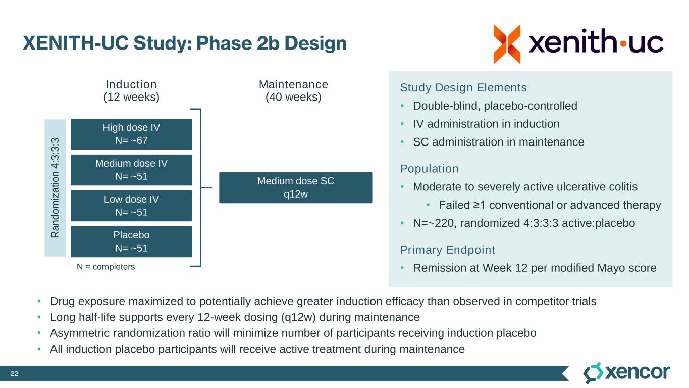 The Phase 2b study of XmAb942 in UC (XENITH-UC) will be a randomized, double-blind, placebo-controlled trial in patients with moderate-to-severely active UC, whose disease has progressed after at least one conventional or advanced therapy. XmAb942 will be administered intravenously during the 12-week induction period and subcutaneously every 12 weeks during the maintenance period. The primary endpoint of the study will be clinical remission based on the modified Mayo score at week 12. The study is designed to enroll approximately 220 patients across three induction dose levels and powered to enable Phase 3 dose selection. XENITH-UC is expected to start in the second half of 2025.