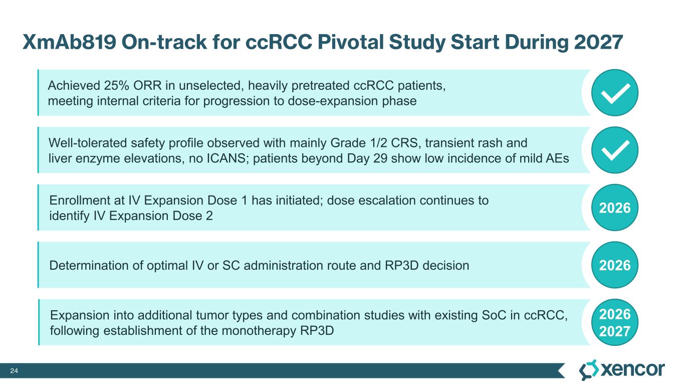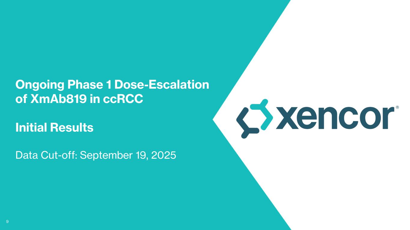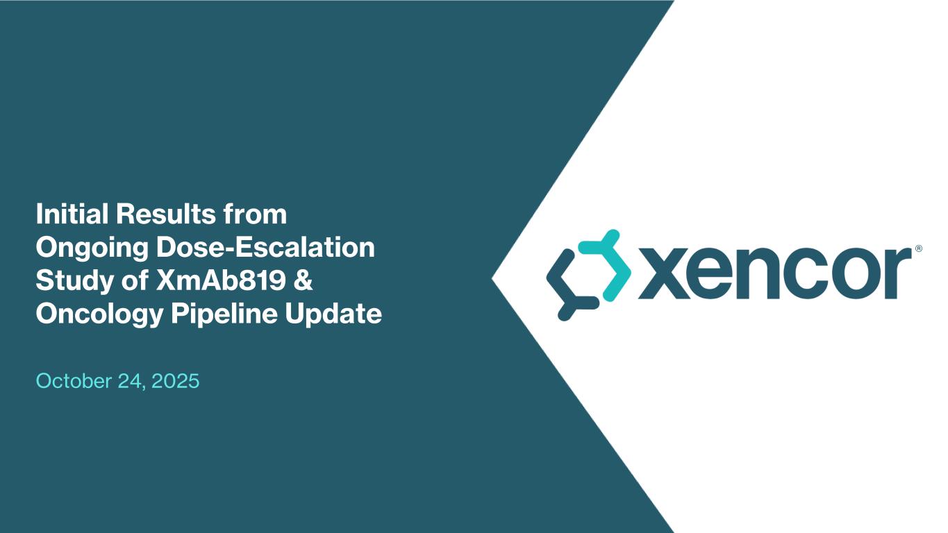 PASADENA, Calif.--Oct. 24, 2025-- Xencor, Inc. (NASDAQ:XNCR), a clinical-stage biopharmaceutical company developing engineered antibodies for the treatment of cancer and autoimmune diseases, today announced initial results from the ongoing Phase 1 dose-escalation study of XmAb819, a ENPP3 x CD3 T-cell engaging bispecific antibody, in patients with advanced clear cell renal cell carcinoma (ccRCC). The results were presented in a poster at the AACR-NCI-EORTC Conference on Molecular Targets and Cancer Therapeutics in Boston, Massachusetts.