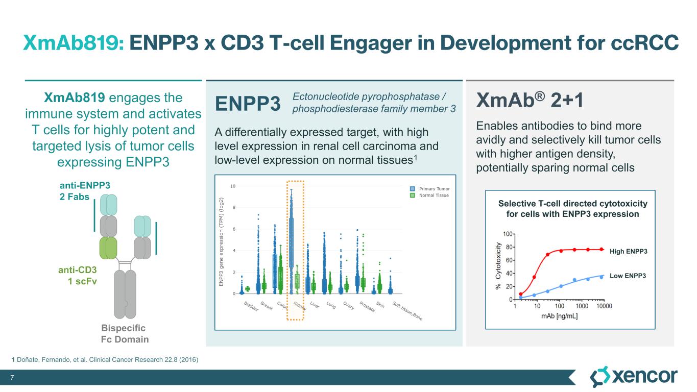 XmAb819 is a first-in-class, tumor-targeted, T-cell engaging XmAb 2+1 bispecific antibody in development for patients with clear cell renal cell carcinoma (ccRCC). XmAb819 engages the immune system and activates T cells for highly potent and targeted lysis of tumor cells expressing ENPP3, an antigen highly expressed on kidney cancers. ENPP3 is a differentially expressed target, with high level expression in renal cell carcinoma (RCC) and low-level expression on normal tissues.