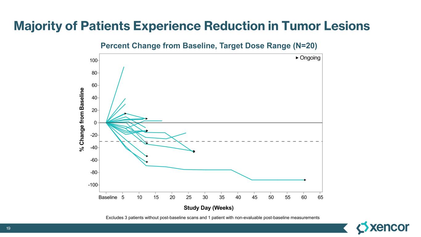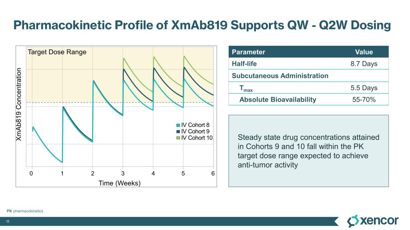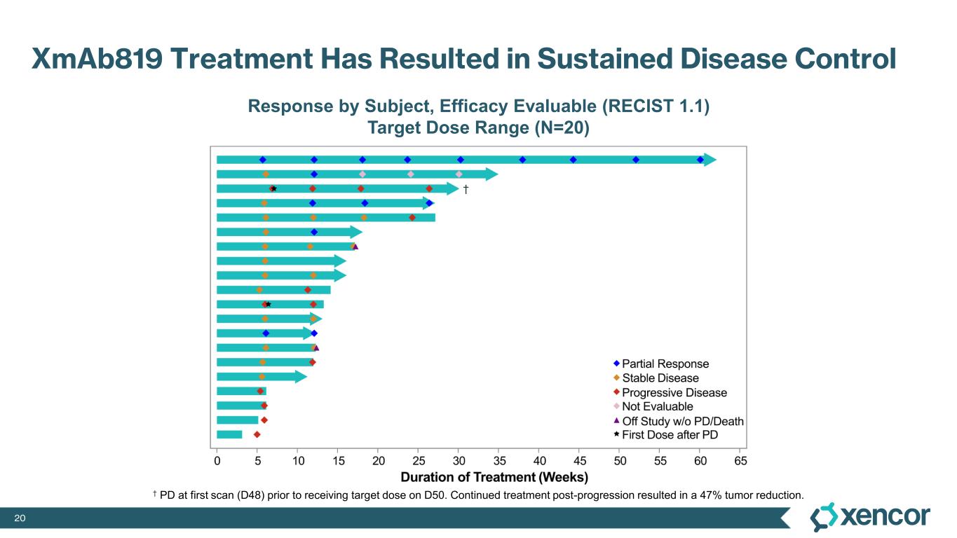 XmAb819 demonstrated evidence of anti-tumor activity and an acceptable safety profile that was generally well tolerated across dose levels. Of the 20 efficacy-evaluable patients treated at the dose levels that were preclinically predicted to be within the target dose range, 25% achieved a partial response (PR) as best response (n=5, 4 confirmed PRs and 1 unconfirmed PR), with a 70% disease control rate (DCR, 14/20). All five responders remain on treatment, and 50% (10/20) of all efficacy-evaluable patients within the target dose range remain on treatment. For one patient with a first-scan assessment of progressive disease, a subsequent 47% reduction in target lesions was reported, and the patient remains on-treatment as of the data cut-off (treatment week 30). All 6 patients within the target dose range with greater than 30% reduction in lesion size remain on treatment as of the data cut-off.