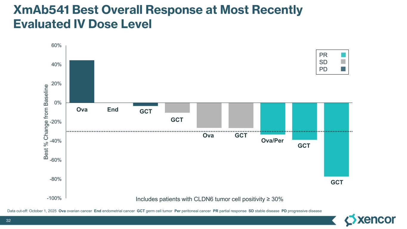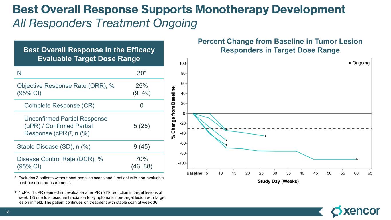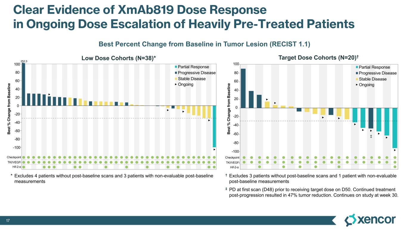 XmAb819 demonstrated evidence of anti-tumor activity and an acceptable safety profile that was generally well tolerated across dose levels. Of the 20 efficacy-evaluable patients treated at the dose levels that were preclinically predicted to be within the target dose range, 25% achieved a partial response (PR) as best response (n=5, 4 confirmed PRs and 1 unconfirmed PR), with a 70% disease control rate (DCR, 14/20). All five responders remain on treatment, and 50% (10/20) of all efficacy-evaluable patients within the target dose range remain on treatment. For one patient with a first-scan assessment of progressive disease, a subsequent 47% reduction in target lesions was reported, and the patient remains on-treatment as of the data cut-off (treatment week 30). All 6 patients within the target dose range with greater than 30% reduction in lesion size remain on treatment as of the data cut-off.
