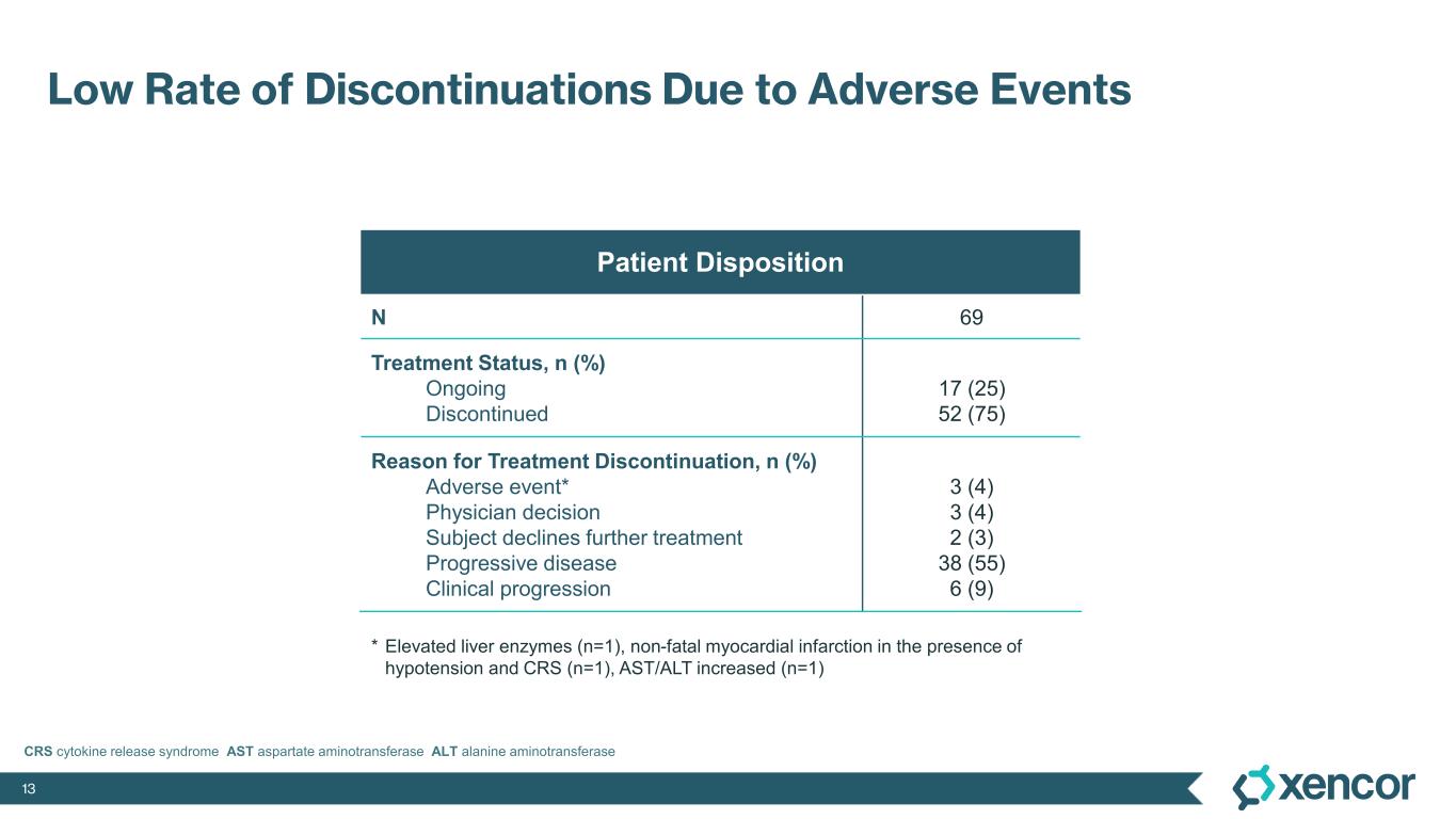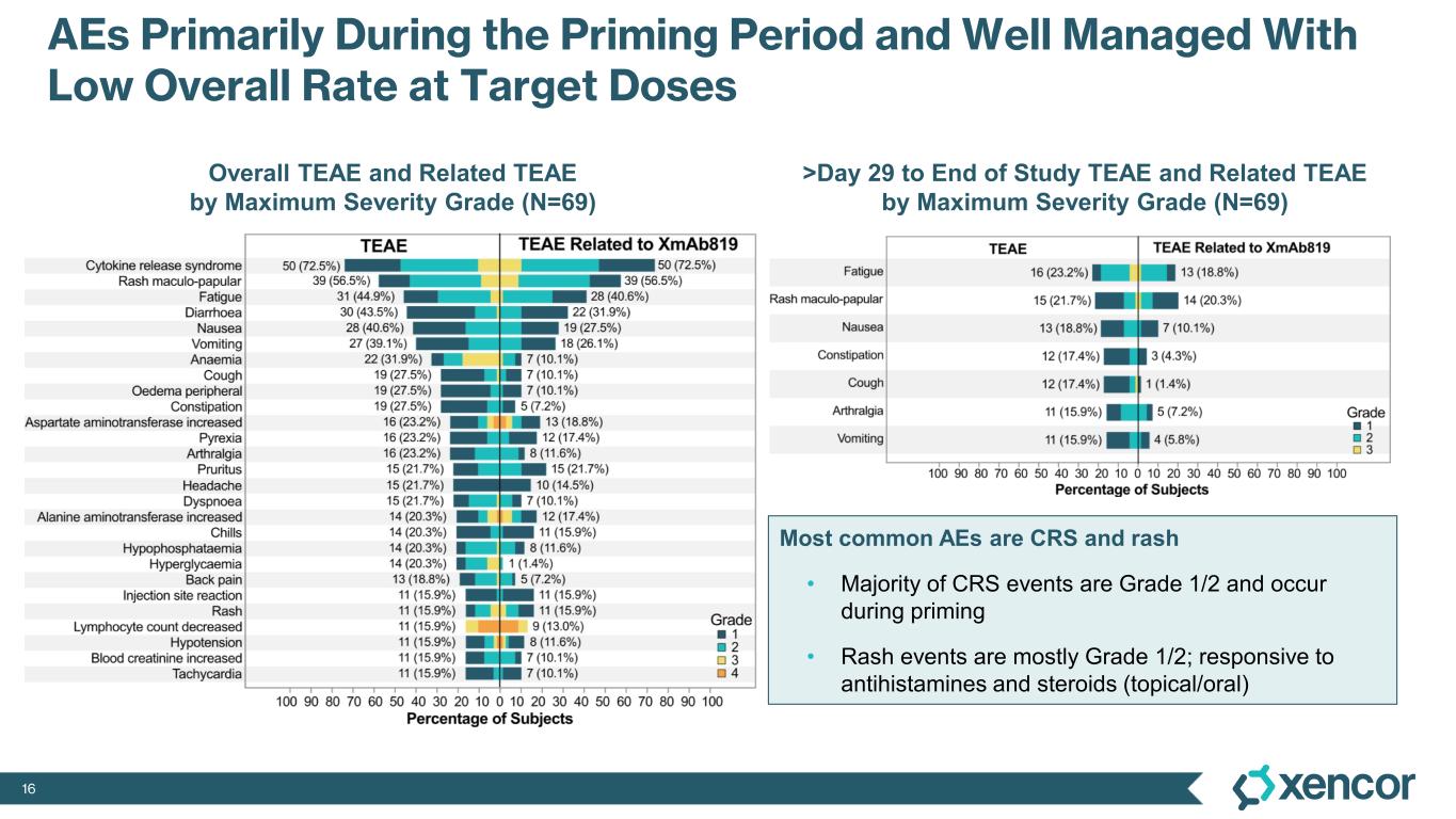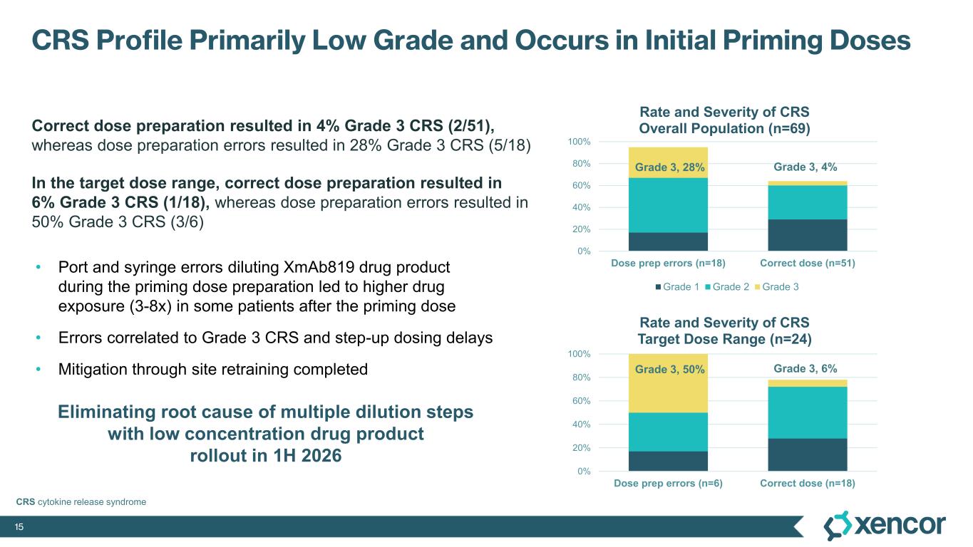 1 While 51 patients received the correct priming dose of XmAb819, higher than expected serum levels of XmAb819 were observed in 18 patients, which was investigated during early 2025 and linked to priming dose preparation errors that resulted from use of certain ports and syringes during drug dilution. Of the 51 patients receiving the correct priming dose, 2 (4%) experienced Grade 3 CRS. Of the 18 patients that were found to have a 3- to 8-fold higher than expected concentration of study drug post-priming dose, 5 (28%) experienced Grade 3 CRS. Mitigation of dosing errors through site retraining is complete, and the root cause of these errors will be eliminated through the introduction of a low concentration formulation to be implemented during the first half of 2026.