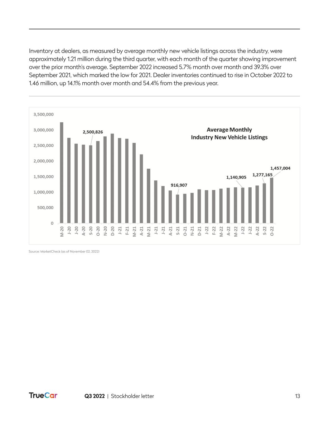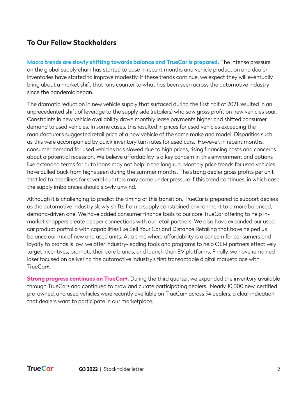 Q3 2022 | Stockholder letter 2 To Our Fellow Stockholders Macro trends are slowly shifting towards balance and TrueCar is prepared. The intense pressure on the global supply chain has started to ease in recent months and vehicle production and dealer inventories have started to improve modestly. If these trends continue, we expect they will eventually bring about a market shift that runs counter to what has been seen across the automotive industry since the pandemic began. The dramatic reduction in new vehicle supply that surfaced during the fi rst half of 2021 resulted in an unprecedented shift of leverage to the supply side (retailers) who saw gross profi t on new vehicles soar. Constraints in new vehicle availability drove monthly lease payments higher and shifted consumer demand to used vehicles. In some cases, this resulted in prices for used vehicles exceeding the manufacturer’s suggested retail price of a new vehicle of the same make and model. Disparities such as this were accompanied by quick inventory turn rates for used cars. However, in recent months, consumer demand for used vehicles has slowed due to high prices, rising fi nancing costs and concerns about a potential recession. We believe affordability is a key concern in this environment and options like extended terms for auto loans may not help in the long run. Monthly price trends for used vehicles have pulled back from highs seen during the summer months. The strong dealer gross profi ts per unit that led to headlines for several quarters may come under pressure if this trend continues, in which case the supply imbalances should slowly unwind. Although it is challenging to predict the timing of this transition, TrueCar is prepared to support dealers as the automotive industry slowly shifts from a supply constrained environment to a more balanced, demand-driven one. We have added consumer fi nance tools to our core TrueCar offering to help in- market shoppers create deeper connections with our retail partners. We also have expanded our used car product portfolio with capabilities like Sell Your Car and Distance Retailing that have helped us balance our mix of new and used units. At a time where affordability is a concern for consumers and loyalty to brands is low, we offer industry-leading tools and programs to help OEM partners effectively target incentives, promote their core brands, and launch their EV platforms. Finally, we have remained laser focused on delivering the automotive industry’s fi rst transactable digital marketplace with TrueCar+. Strong progress continues on TrueCar+. During the third quarter, we expanded the inventory available through TrueCar+ and continued to grow and curate participating dealers. Nearly 10,000 new, certifi ed pre-owned, and used vehicles were recently available on TrueCar+ across 94 dealers, a clear indication that dealers want to participate in our marketplace.