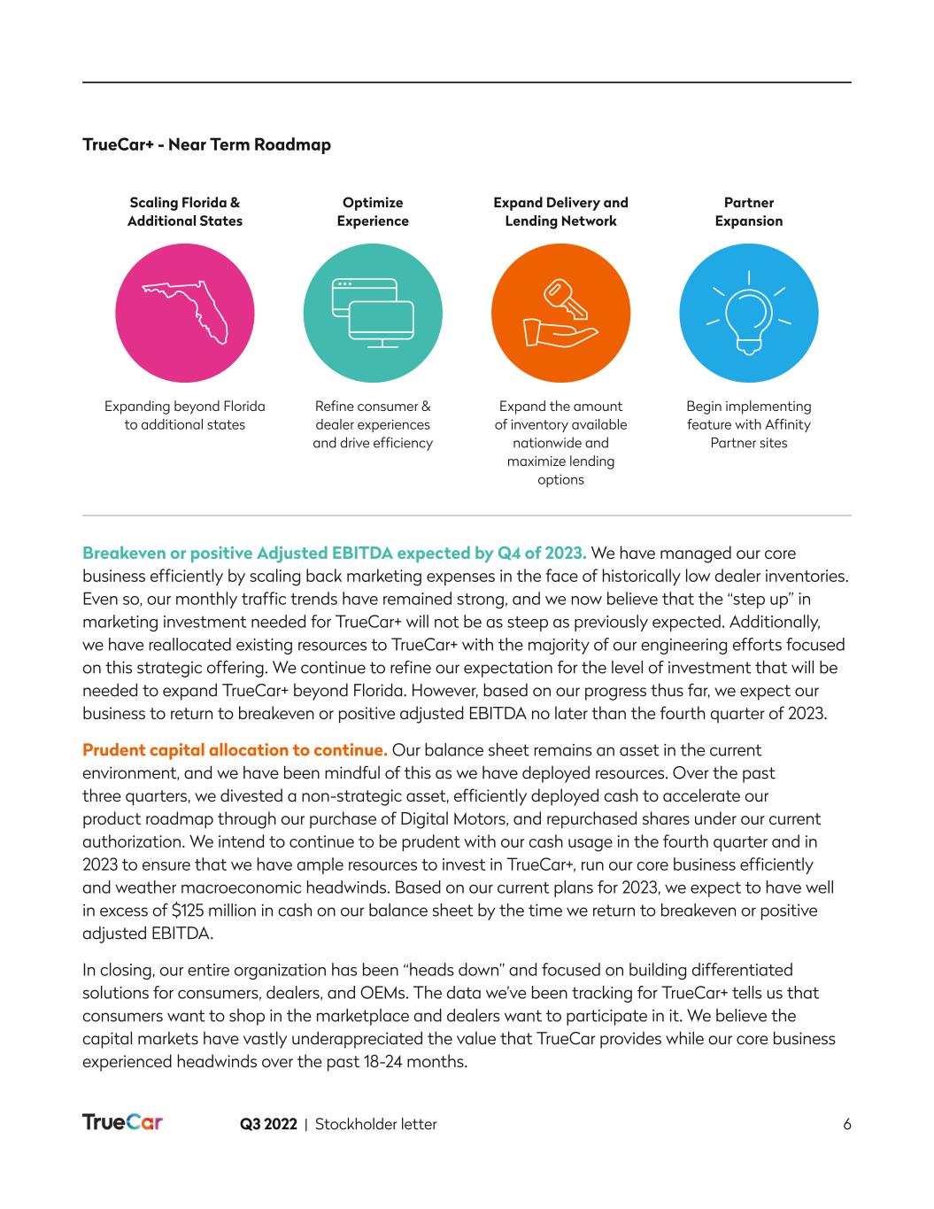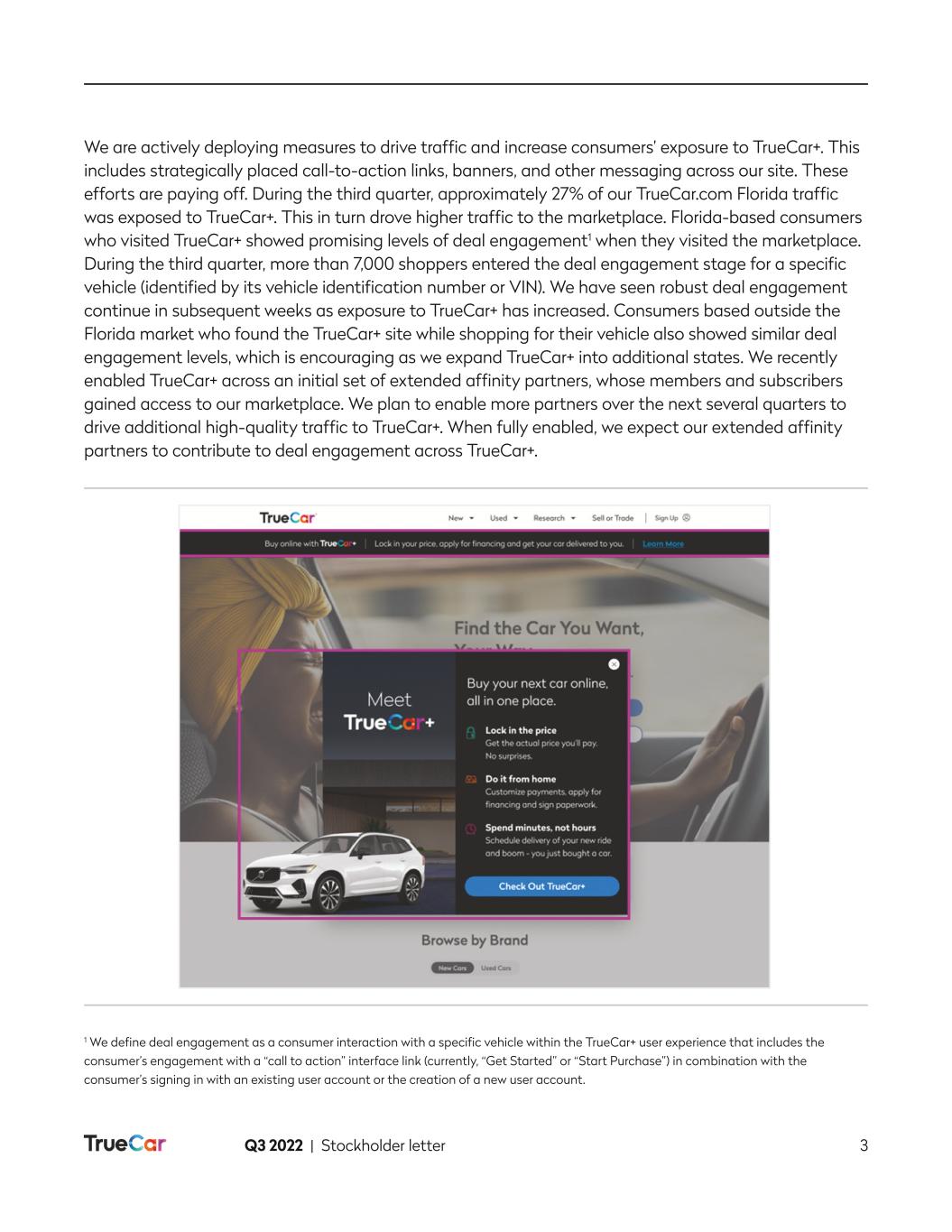 Q3 2022 | Stockholder letter 3 1 We defi ne deal engagement as a consumer interaction with a specifi c vehicle within the TrueCar+ user experience that includes the consumer’s engagement with a “call to action” interface link (currently, “Get Started” or “Start Purchase”) in combination with the consumer’s signing in with an existing user account or the creation of a new user account. We are actively deploying measures to drive traffi c and increase consumers’ exposure to TrueCar+. This includes strategically placed call-to-action links, banners, and other messaging across our site. These efforts are paying off. During the third quarter, approximately 27% of our TrueCar.com Florida traffi c was exposed to TrueCar+. This in turn drove higher traffi c to the marketplace. Florida-based consumers who visited TrueCar+ showed promising levels of deal engagement1 when they visited the marketplace. During the third quarter, more than 7,000 shoppers entered the deal engagement stage for a specifi c vehicle (identifi ed by its vehicle identifi cation number or VIN). We have seen robust deal engagement continue in subsequent weeks as exposure to TrueCar+ has increased. Consumers based outside the Florida market who found the TrueCar+ site while shopping for their vehicle also showed similar deal engagement levels, which is encouraging as we expand TrueCar+ into additional states. We recently enabled TrueCar+ across an initial set of extended affi nity partners, whose members and subscribers gained access to our marketplace. We plan to enable more partners over the next several quarters to drive additional high-quality traffi c to TrueCar+. When fully enabled, we expect our extended affi nity partners to contribute to deal engagement across TrueCar+.