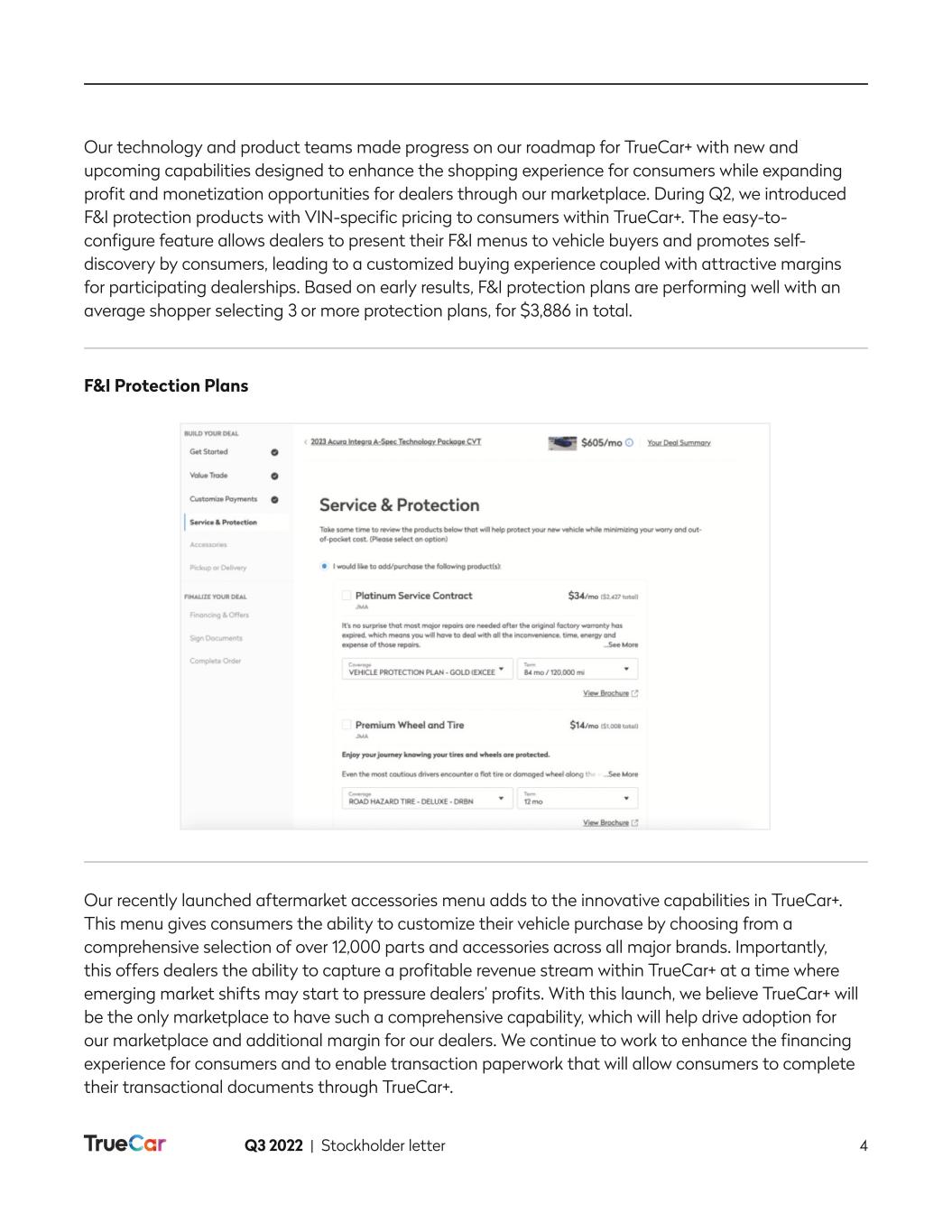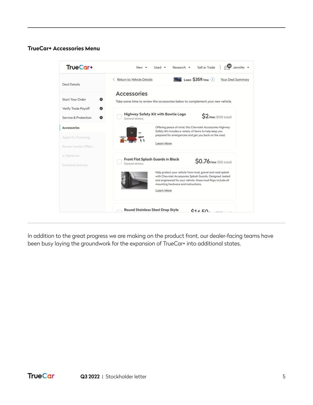 Q3 2022 | Stockholder letter 4 Our technology and product teams made progress on our roadmap for TrueCar+ with new and upcoming capabilities designed to enhance the shopping experience for consumers while expanding profi t and monetization opportunities for dealers through our marketplace. During Q2, we introduced F&I protection products with VIN-specifi c pricing to consumers within TrueCar+. The easy-to- confi gure feature allows dealers to present their F&I menus to vehicle buyers and promotes self- discovery by consumers, leading to a customized buying experience coupled with attractive margins for participating dealerships. Based on early results, F&I protection plans are performing well with an average shopper selecting 3 or more protection plans, for $3,886 in total. F&I Protection Plans Our recently launched aftermarket accessories menu adds to the innovative capabilities in TrueCar+. This menu gives consumers the ability to customize their vehicle purchase by choosing from a comprehensive selection of over 12,000 parts and accessories across all major brands. Importantly, this offers dealers the ability to capture a profi table revenue stream within TrueCar+ at a time where emerging market shifts may start to pressure dealers’ profi ts. With this launch, we believe TrueCar+ will be the only marketplace to have such a comprehensive capability, which will help drive adoption for our marketplace and additional margin for our dealers. We continue to work to enhance the fi nancing experience for consumers and to enable transaction paperwork that will allow consumers to complete their transactional documents through TrueCar+.