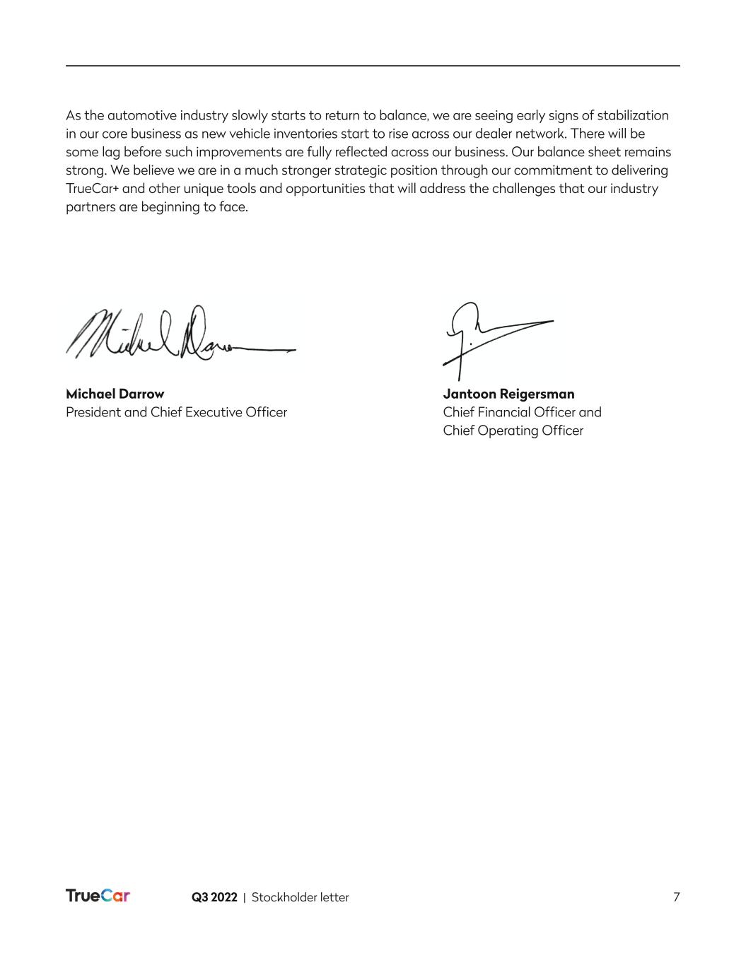 Q3 2022 | Stockholder letter 7 Michael Darrow President and Chief Executive Offi cer Jantoon Reigersman Chief Financial Offi cer and Chief Operating Offi cer As the automotive industry slowly starts to return to balance, we are seeing early signs of stabilization in our core business as new vehicle inventories start to rise across our dealer network. There will be some lag before such improvements are fully refl ected across our business. Our balance sheet remains strong. We believe we are in a much stronger strategic position through our commitment to delivering TrueCar+ and other unique tools and opportunities that will address the challenges that our industry partners are beginning to face.