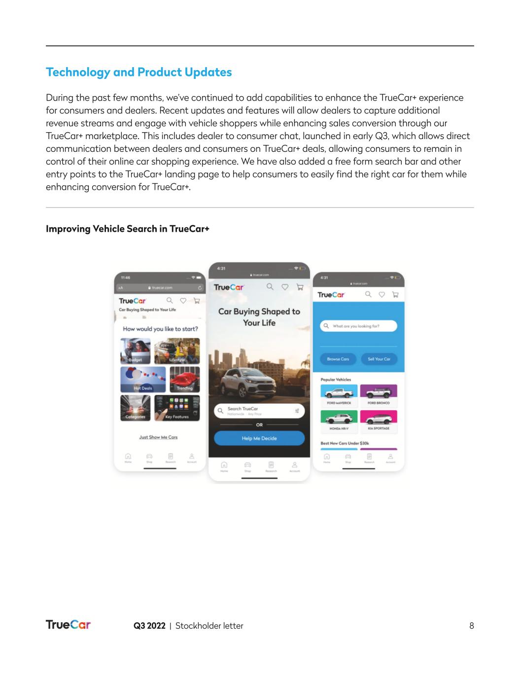 Q3 2022 | Stockholder letter 8 Technology and Product Updates During the past few months, we’ve continued to add capabilities to enhance the TrueCar+ experience for consumers and dealers. Recent updates and features will allow dealers to capture additional revenue streams and engage with vehicle shoppers while enhancing sales conversion through our TrueCar+ marketplace. This includes dealer to consumer chat, launched in early Q3, which allows direct communication between dealers and consumers on TrueCar+ deals, allowing consumers to remain in control of their online car shopping experience. We have also added a free form search bar and other entry points to the TrueCar+ landing page to help consumers to easily fi nd the right car for them while enhancing conversion for TrueCar+. Improving Vehicle Search in TrueCar+